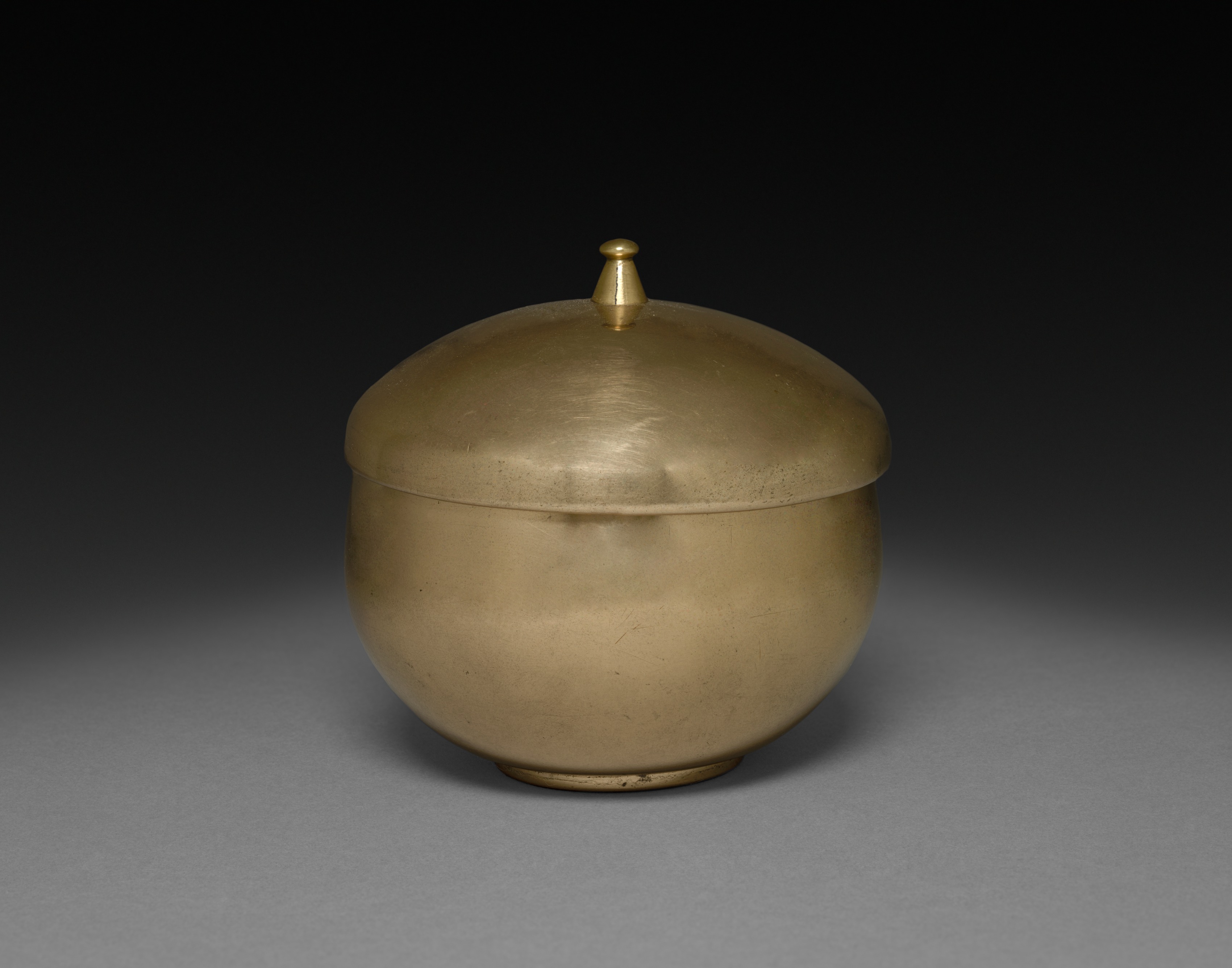 The image shows a gold-colored, spherical container. The container has a lid with a small knob on top. The container and lid are made of a shiny, gold-colored metal. The background is black at the top and fades to gray at the bottom. The container is centered in the image and casts a shadow on the surface below it. The artist and title of the image is "Container".