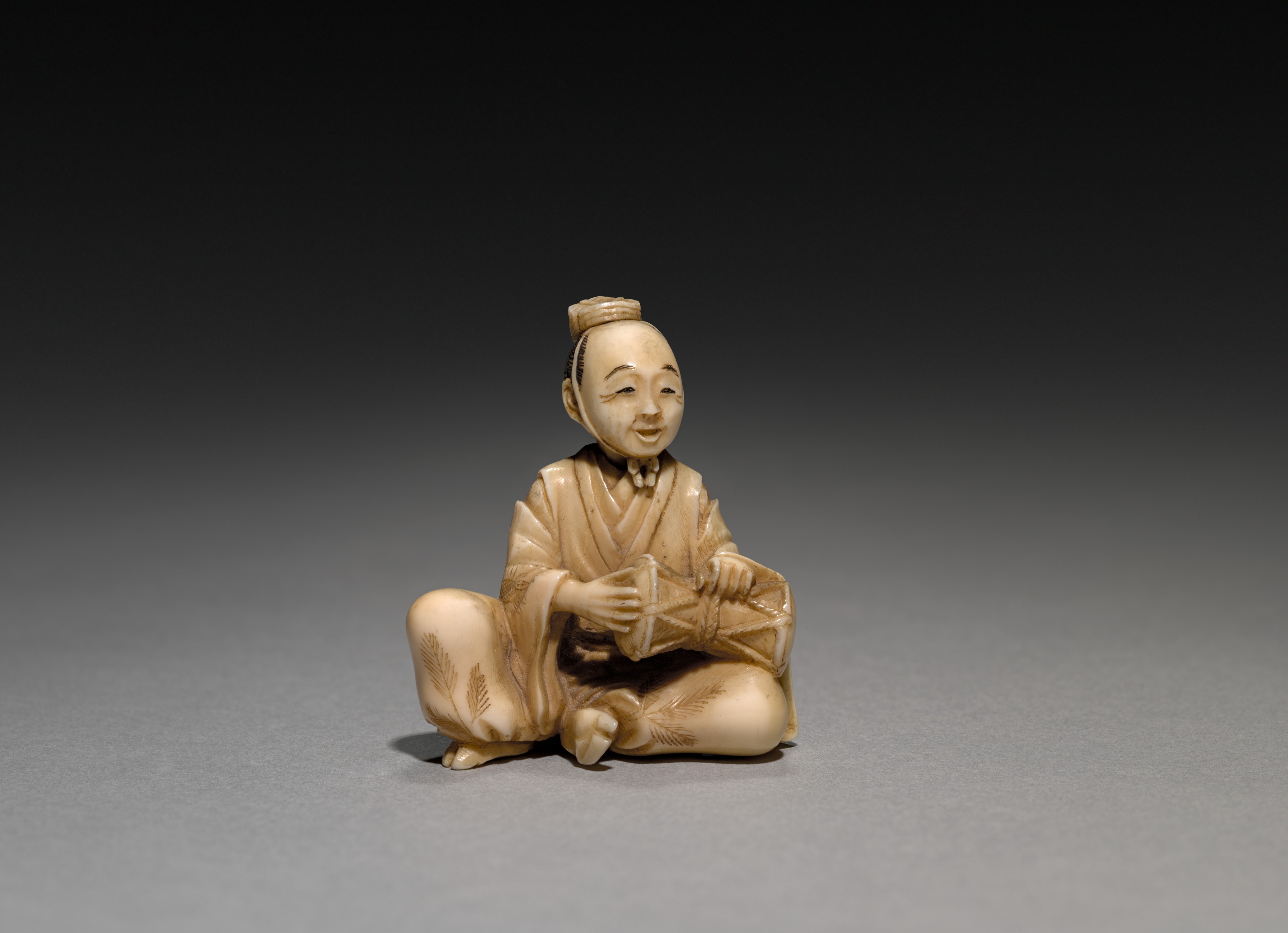 The sculpture depicts a seated man with a drum, titled "Man with a Drum". The figure is carved from a light-colored material, possibly ivory or bone, and features a smiling face with a small nose and mouth. The man has a distinctive hairstyle, with his hair pulled back into a small bun on top of his head. He wears a traditional Japanese robe with a V-neck and long sleeves, which is intricately carved with leaf-like designs. The man's legs are crossed, with his right leg bent in front of his left, and his feet are visible. He holds a drum in his hands, which rests on his lap. The drum has a geometric pattern carved into it. The background of the image is a gradient of dark gray to light gray, with the figure casting a shadow on the surface below.