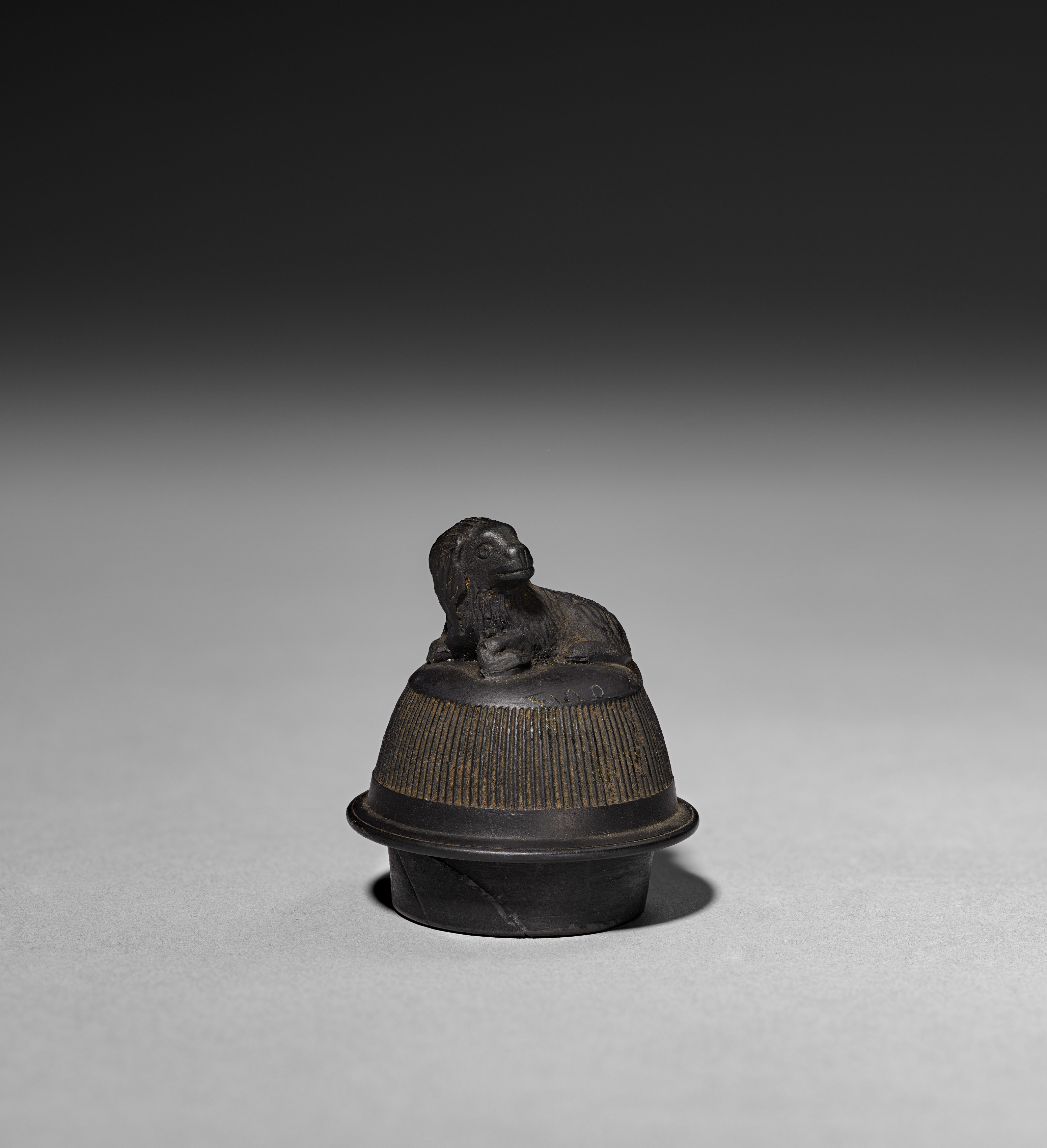 The cover is for a tea caddy. The object is made of dark metal, possibly bronze or brass, and features a lion on top. The lion is sitting on a rounded object with vertical lines around it. The object has a wide base and a narrower middle section. The background is a gradient from dark at the top to light gray at the bottom. The object casts a shadow on the surface below it.