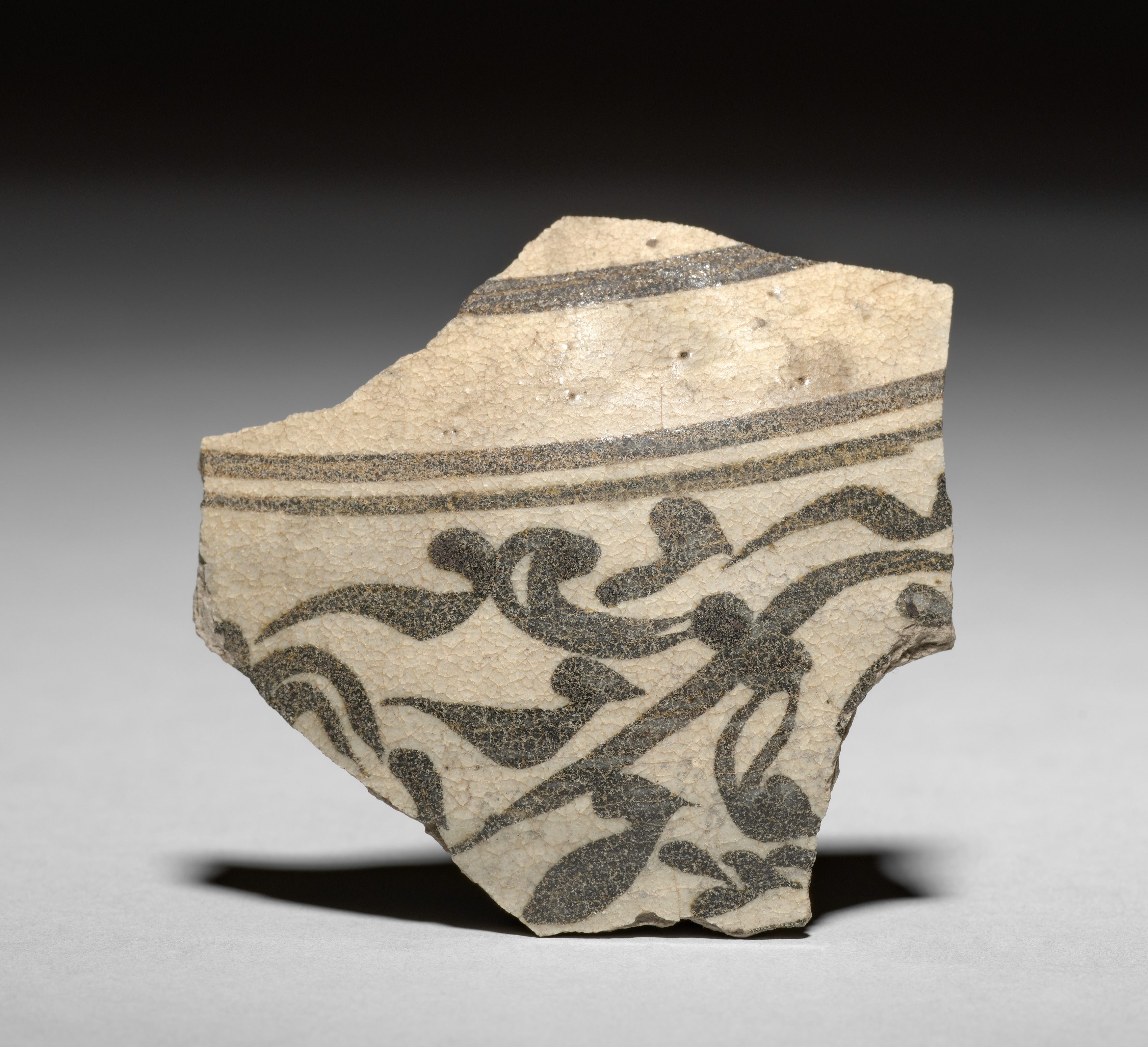 The Pottery Fragment by artist is a broken piece of pottery. The fragment has a beige background. It has a dark gray design on the bottom half, which appears to be a stylized floral pattern. The top half features two horizontal dark gray stripes. The fragment's edges are rough and uneven, indicating that it has been broken off from a larger piece. The background of the image is a gradient that transitions from black at the top to white at the bottom, with the fragment casting a shadow on the surface below it.