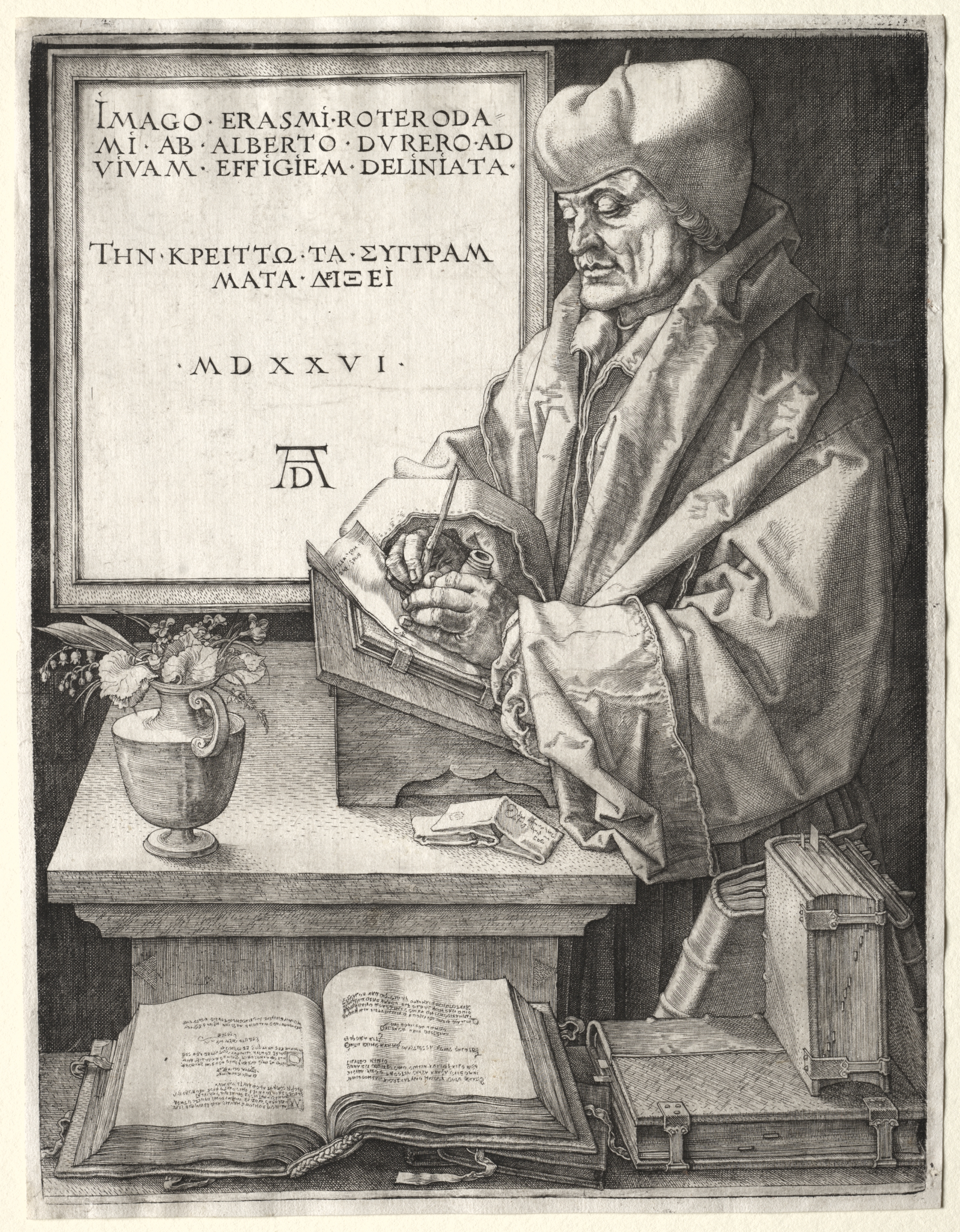 Black and white portrait of a man wearing a large cap and robe sitting at a table. The man has his left hand on his face and holds a quill in his right hand over a writing box. An open book rests on a stand in front of him. The table he sits at has a vase with flowers on it to his left and an open book on the floor to his right. Behind him on the wall is a framed panel with writing on it. The man sits on a box with his right leg. The image conveys a sense of contemplation. The drawing or print is detailed with shading and lines.