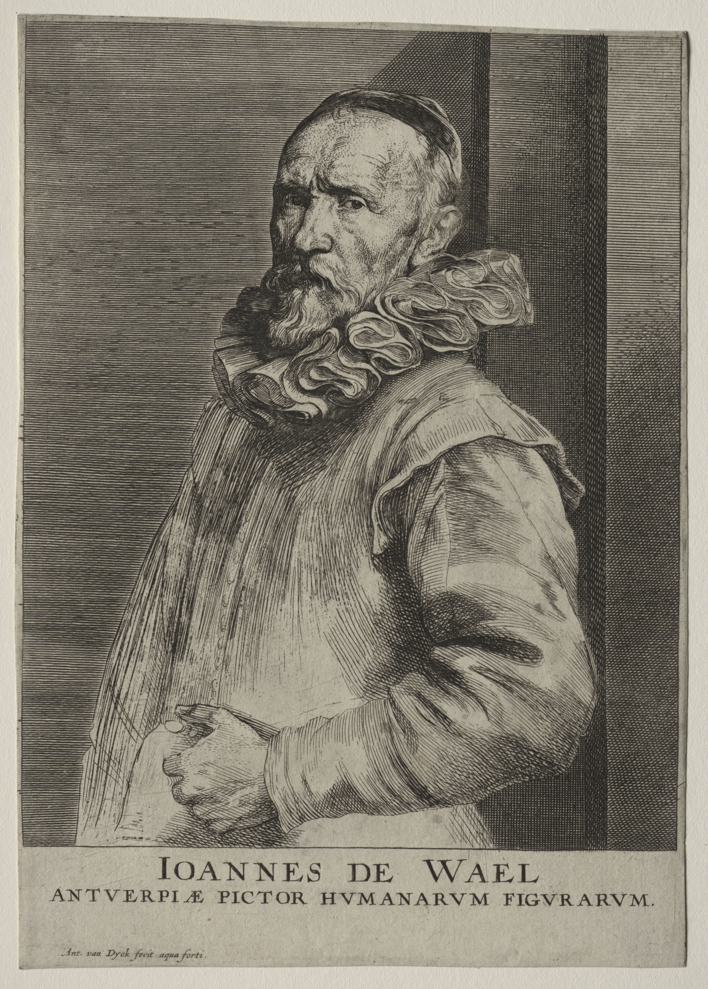 Black and white drawing of a man with a receding hairline and short hair on the sides of his head. The man has a long beard and moustache. He wears a large, frilled collar and a billowy-sleeved shirt. The man is shown from the waist up, facing slightly to his right. The background consists of lines in varying densities, suggesting shading. The man stands in front of a vertical line that could represent a wall or pillar. There is a block of text in a foreign language across the bottom. The text reads "IOANNES DE WAEL" on the first line, and "ANTVERPIÆ PICTOR HUMANARVM FIGVRARVM" on the second line. The image is framed by a light-coloured border.