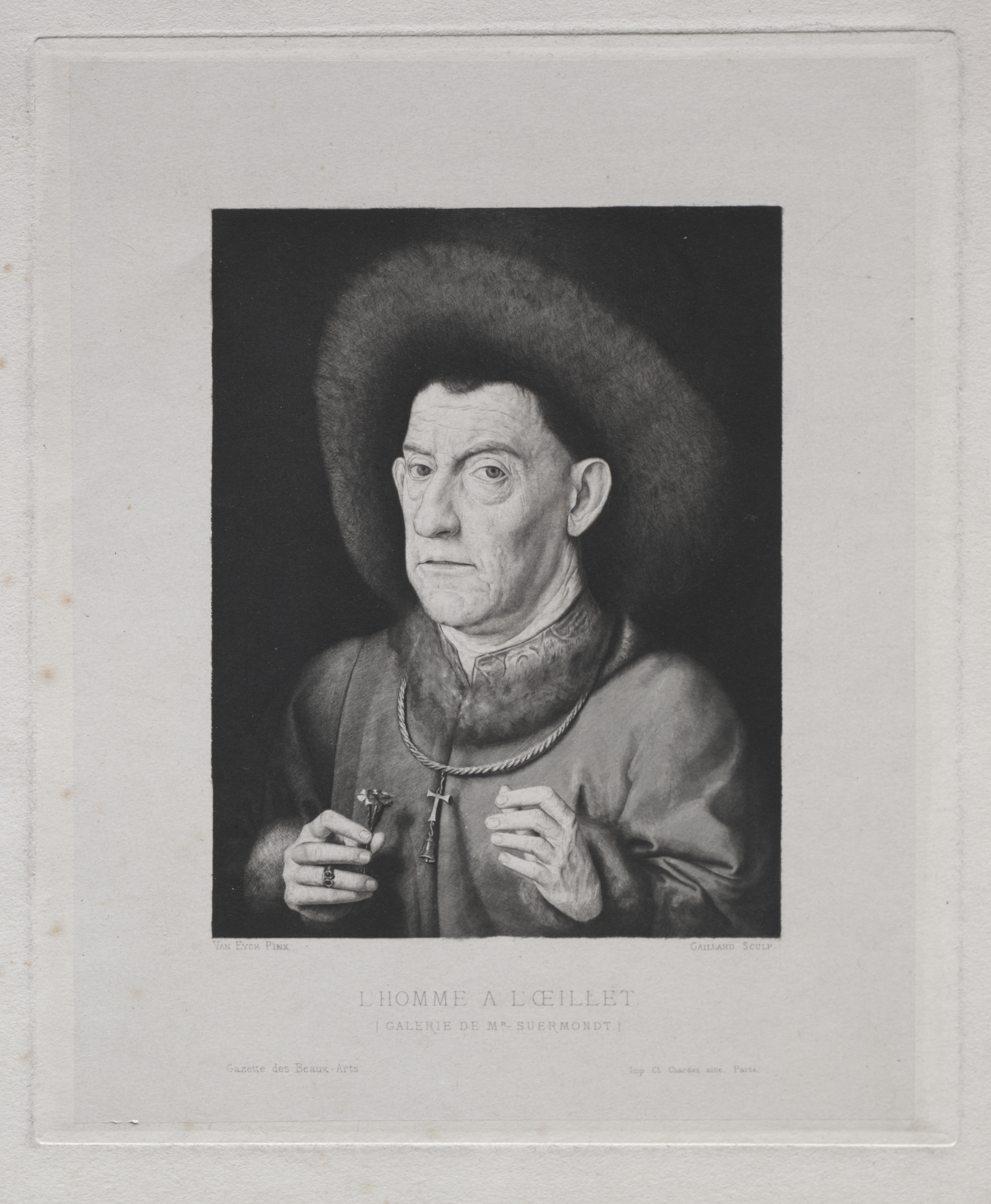 Black and white image of a man wearing a wide-brimmed hat, a high-necked shirt with a ruffled collar and a necklace with a cross. He holds a pink carnation in his right hand. The man is depicted against a dark background. Text at the bottom of the image reads "L'Homme a l'oeillet" and "Galerie de M. Suermondt". The image is surrounded by a white border.