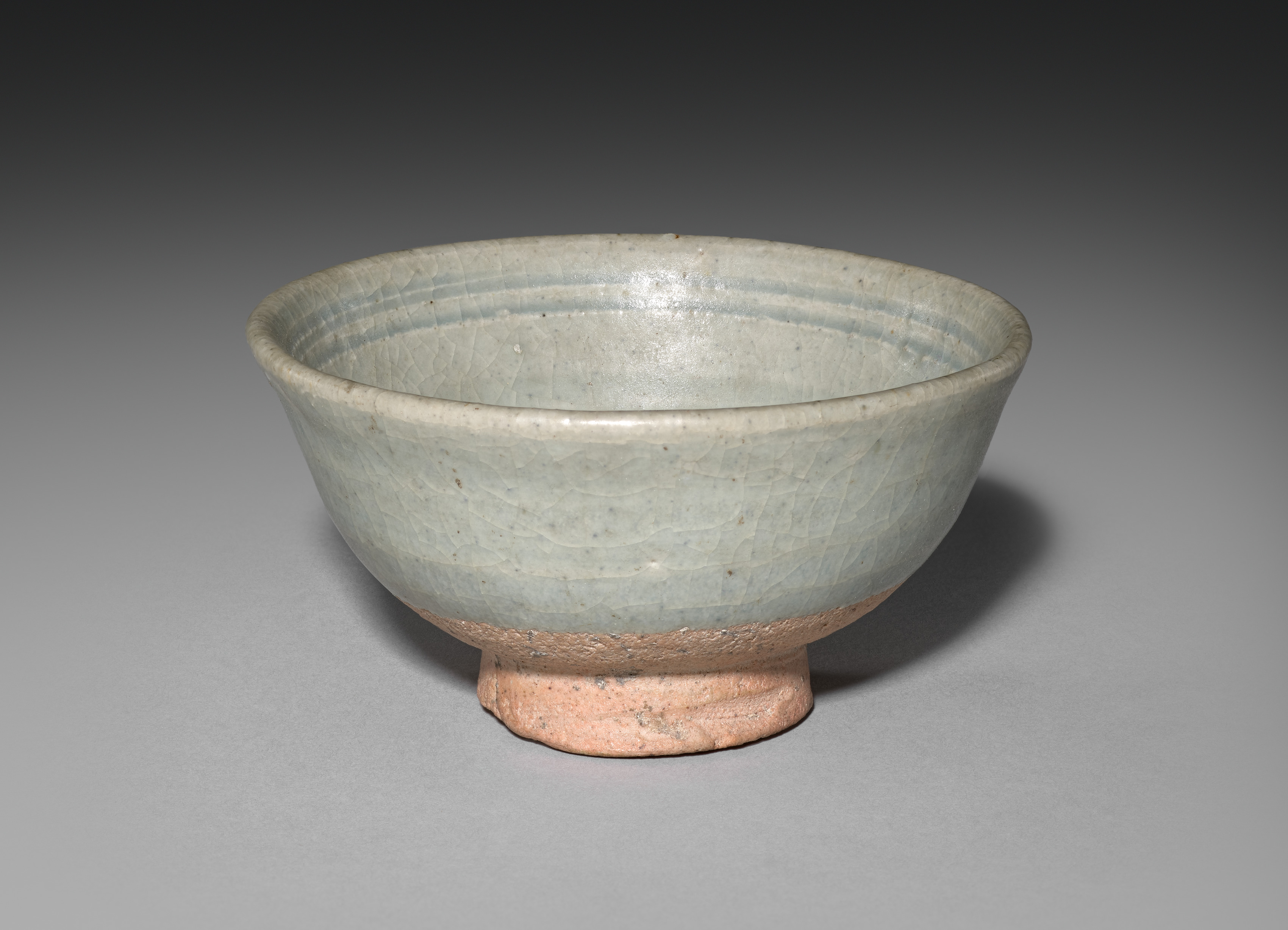 The image shows a ceramic bowl titled "Bowl" by an unknown artist. The bowl is centered in the image. The bowl has a wide mouth and a short foot. The bowl is glazed with a light blue-green color, and the glaze is cracked, giving it a textured appearance. The base of the bowl is unglazed and has a reddish-brown color. The background of the image is a gradient of gray, with the bowl casting a shadow on the surface below it.
