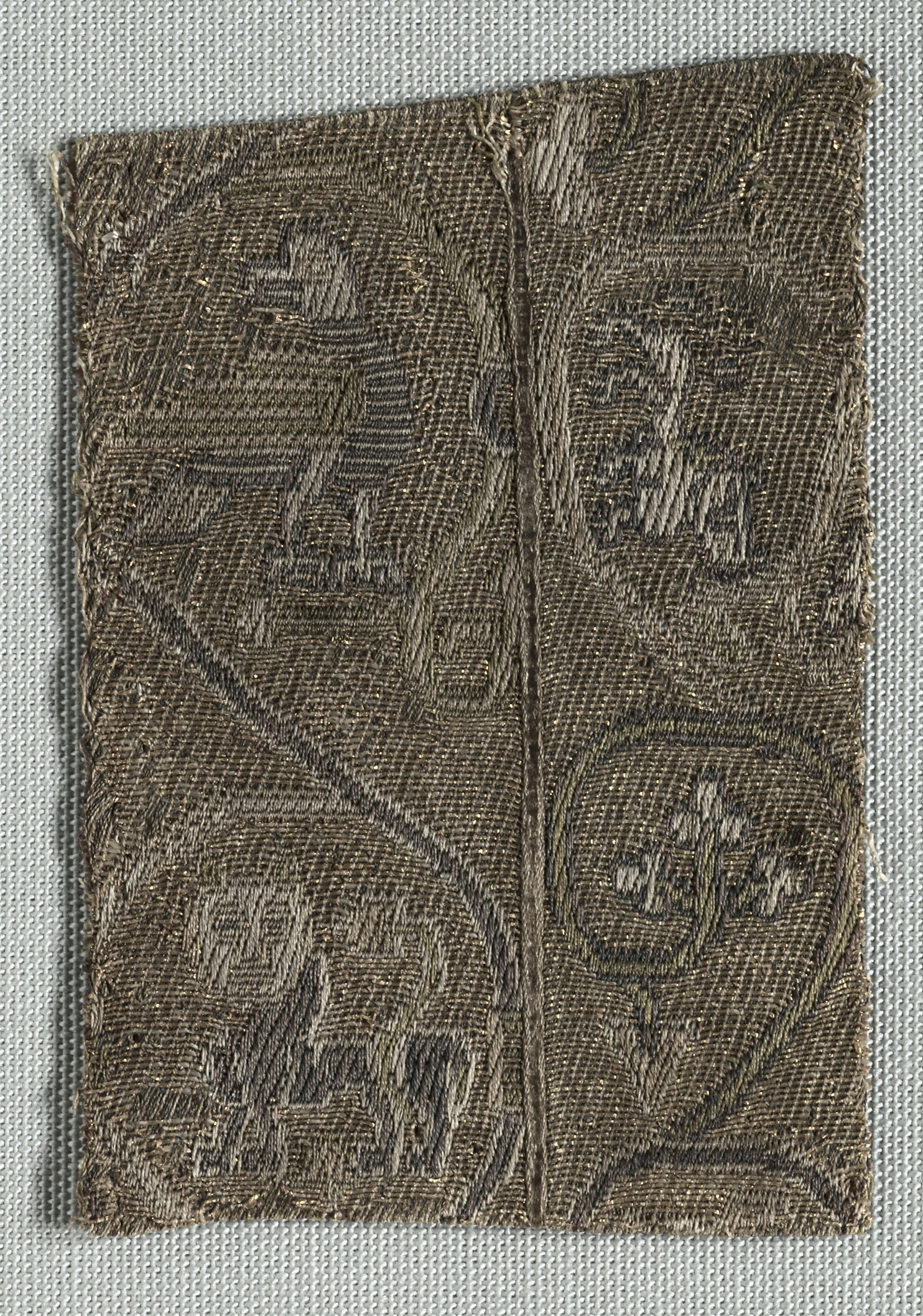 Brown woven fabric with visible vertical seam down center, on light grey background. Four sections of woven design. Top left section has horizontal band with three small shapes underneath. Top right section has zigzag band with row of three small shapes underneath. Bottom right section has circular design with curved lines and five small circular shapes. Bottom left section has curved diagonal lines and small shapes. Rough frayed edges around entire piece. "Fragment of a Band" by unidentified artist.