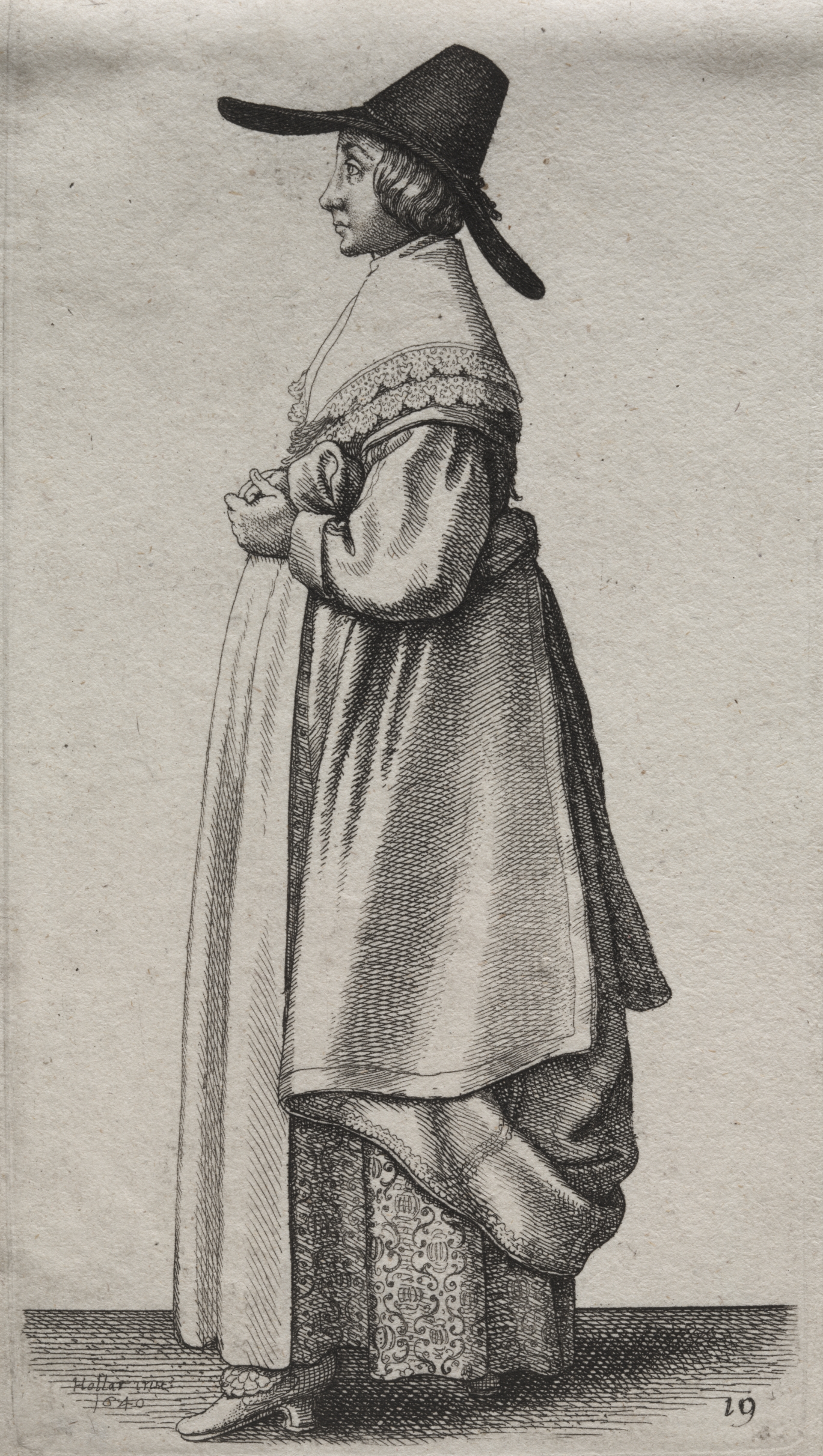 Black and white drawing of a woman standing facing left. The woman wears a wide-brimmed hat, a dress with a high neckline and puffy sleeves, a flowered petticoat, and low-heeled shoes. The dress appears to have lace trim at the top. Her hands are clasped in front of her. The drawing appears to be on textured paper and the number 19 appears in the bottom right corner. The drawing is in a realistic style.