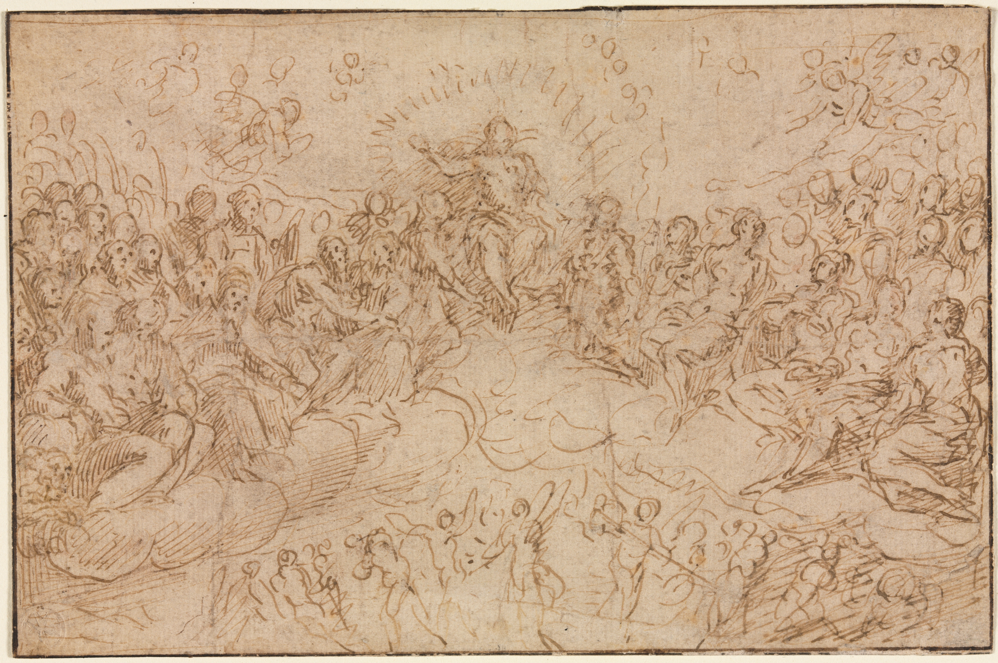 The Last Judgment by Jean Cousin: a sketch of a large group of people, some with halos, on a beige background with a black border; a central figure sits, surrounded by lines suggesting a halo; multiple figures are drawn to the left and right in disarray; some appear to be emerging from the bottom; several angels are in the sky; the entire image is rendered in brown pencil or pen; the paper appears aged.