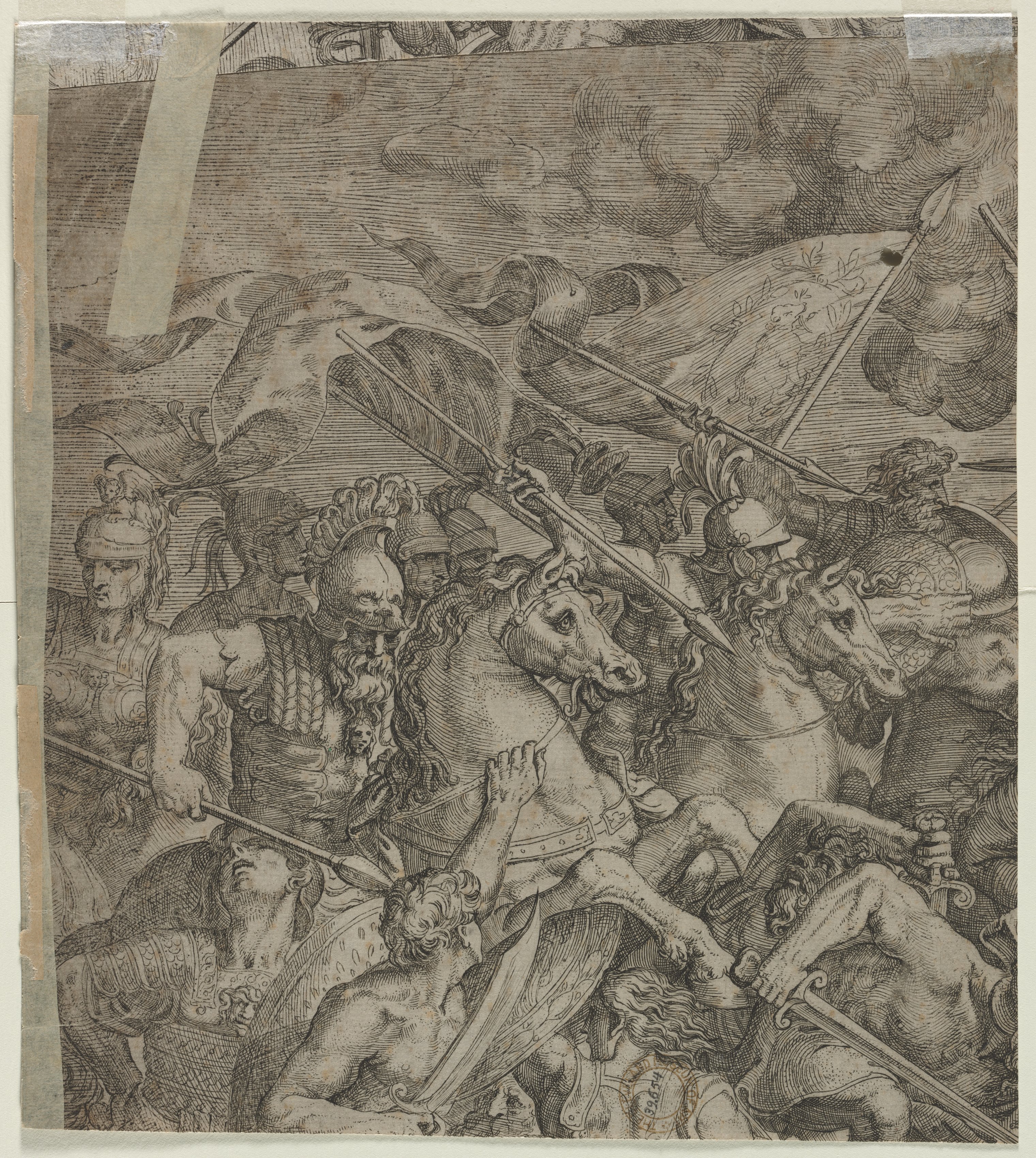 The image depicts a battle scene with multiple men on horseback and on foot, some armed with spears and swords. The men wear armor and helmets, some bare-chested, others fully clothed. Horses are present, one with a saddle and one without, some rearing up. The background features a cloudy sky. The image is rendered in black and white, with detailed cross-hatching. Tape is stuck to the upper left corner of the image. The artwork appears to be an etching, created by Albrecht Dürer, titled "Battle of the Milvian Bridge (fragment) (verso)". The overall mood is chaotic and intense. The image includes a range of textures, from the detailed armor to the cloudy sky.