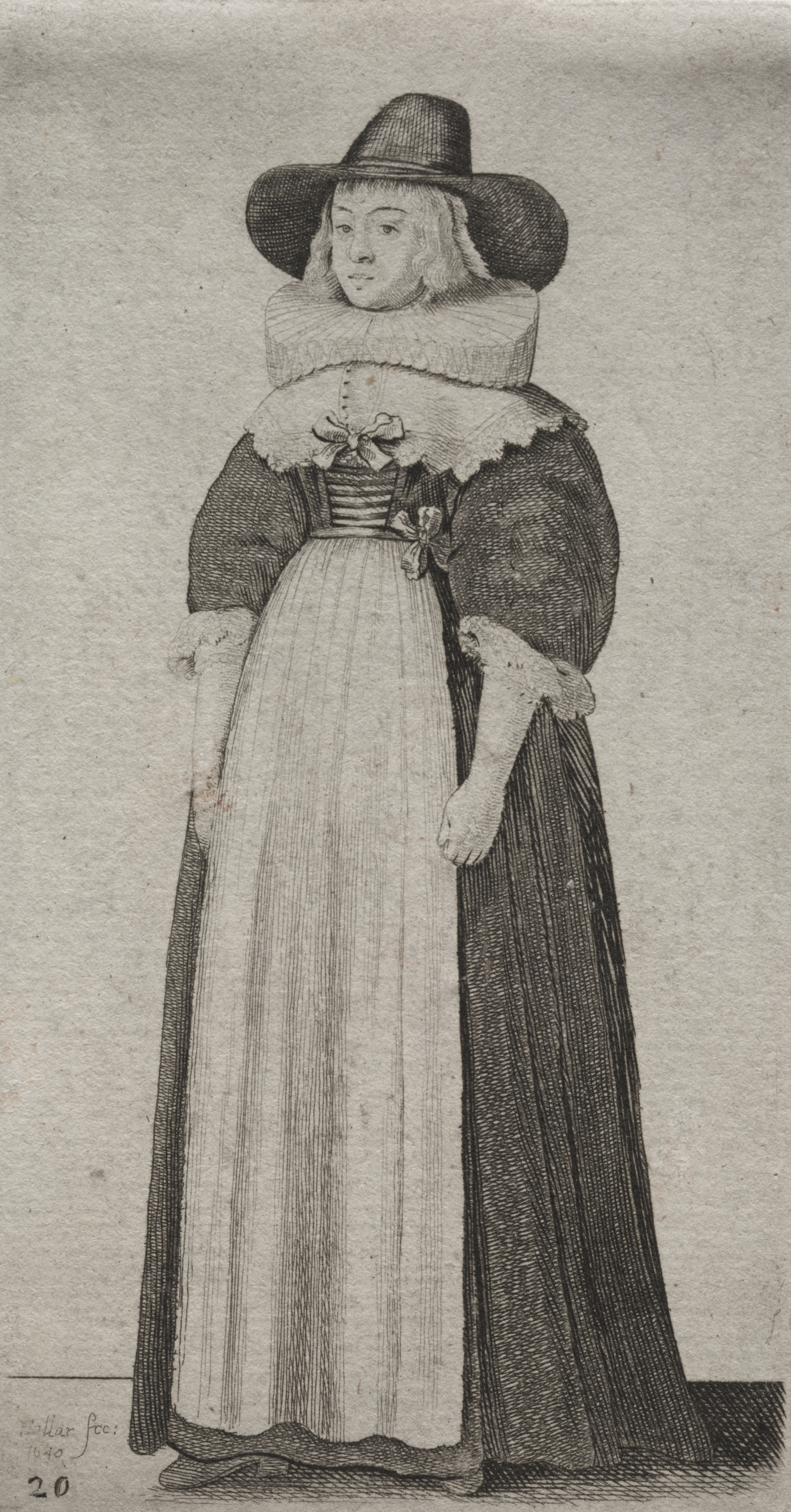 A woman wearing a dark hat with wide brim and a dress with a white skirt, a ribboned bodice, and a dark cape or cloak over her right shoulder; she has a ruffled collar and her hair is shoulder-length. The image is a black and white drawing. The woman faces forward and is standing.
