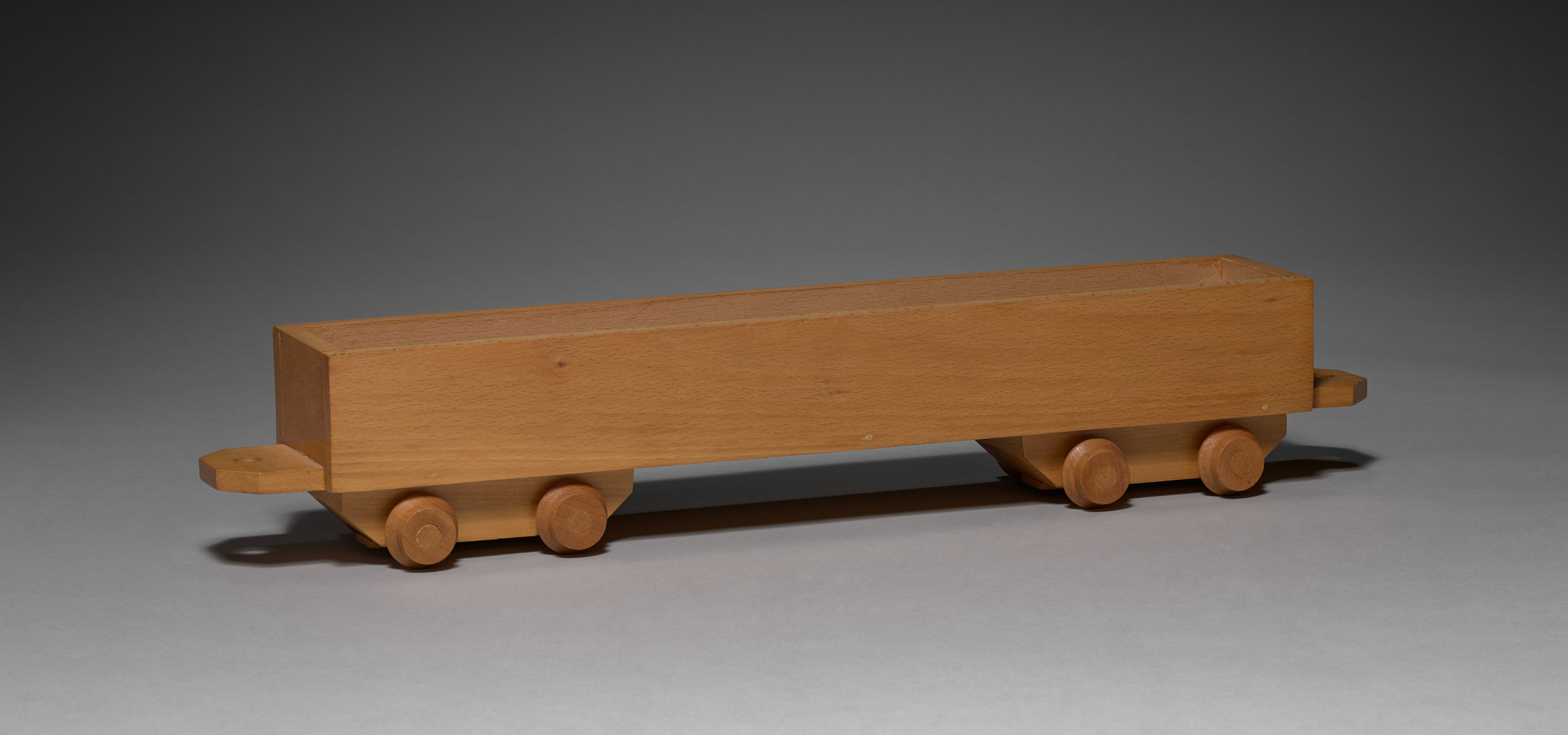 Light brown wooden train car with rectangular body, flat top and straight edges. Four cylindrical wheels, two on each side. Two short, cylindrical protrusions, one on each side, near the ends. Gray background with darker top and lighter bottom. Object casting a shadow on the surface below. Train car positioned at a slight angle.