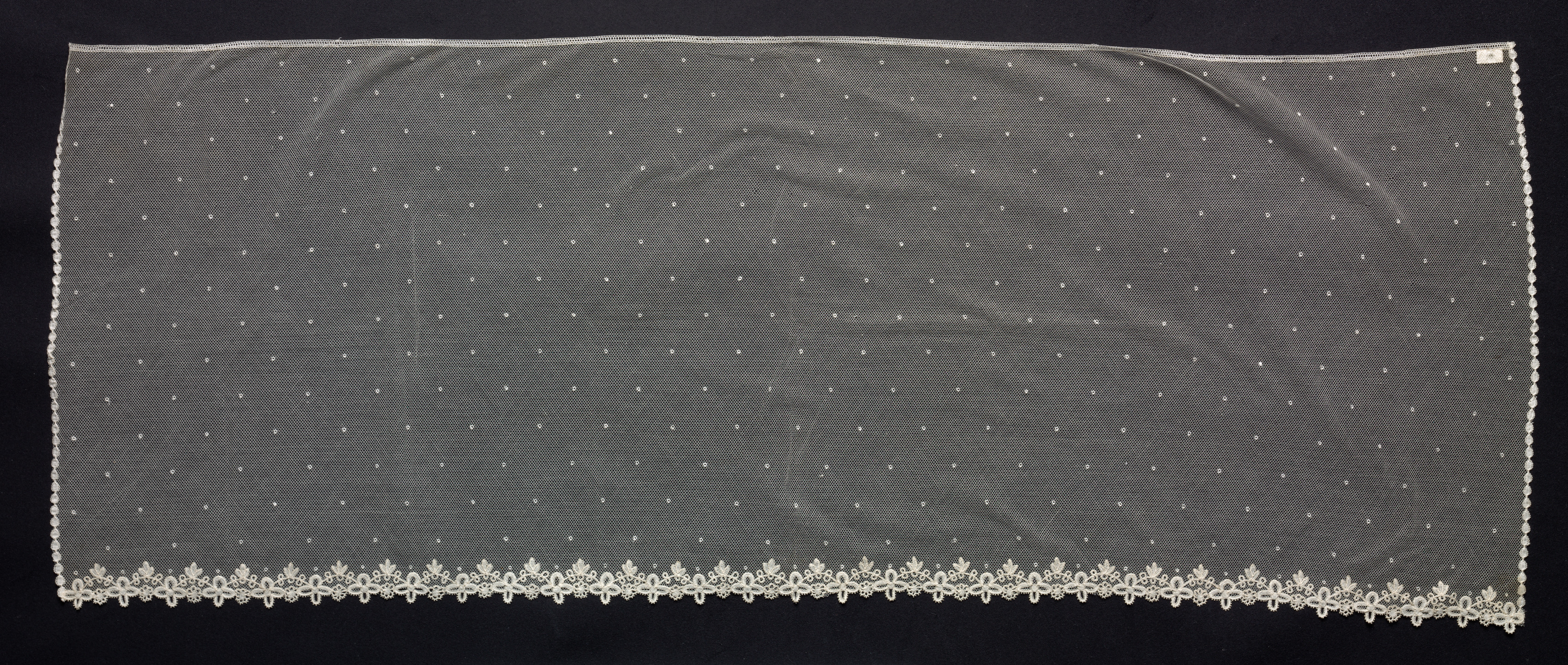 The image shows a rectangular piece of white bobbin and machine lace veil. The veil is rectangular with a solid white background and features small white dots scattered across it. The bottom edge of the veil has an intricate white lace design, while the sides have a simpler white scalloped lace trim. The top edge appears to have a thin white trim. The veil is set against a black background. The overall design and style suggest a delicate and ornate piece, likely used for decorative or ceremonial purposes, by artist unknown.