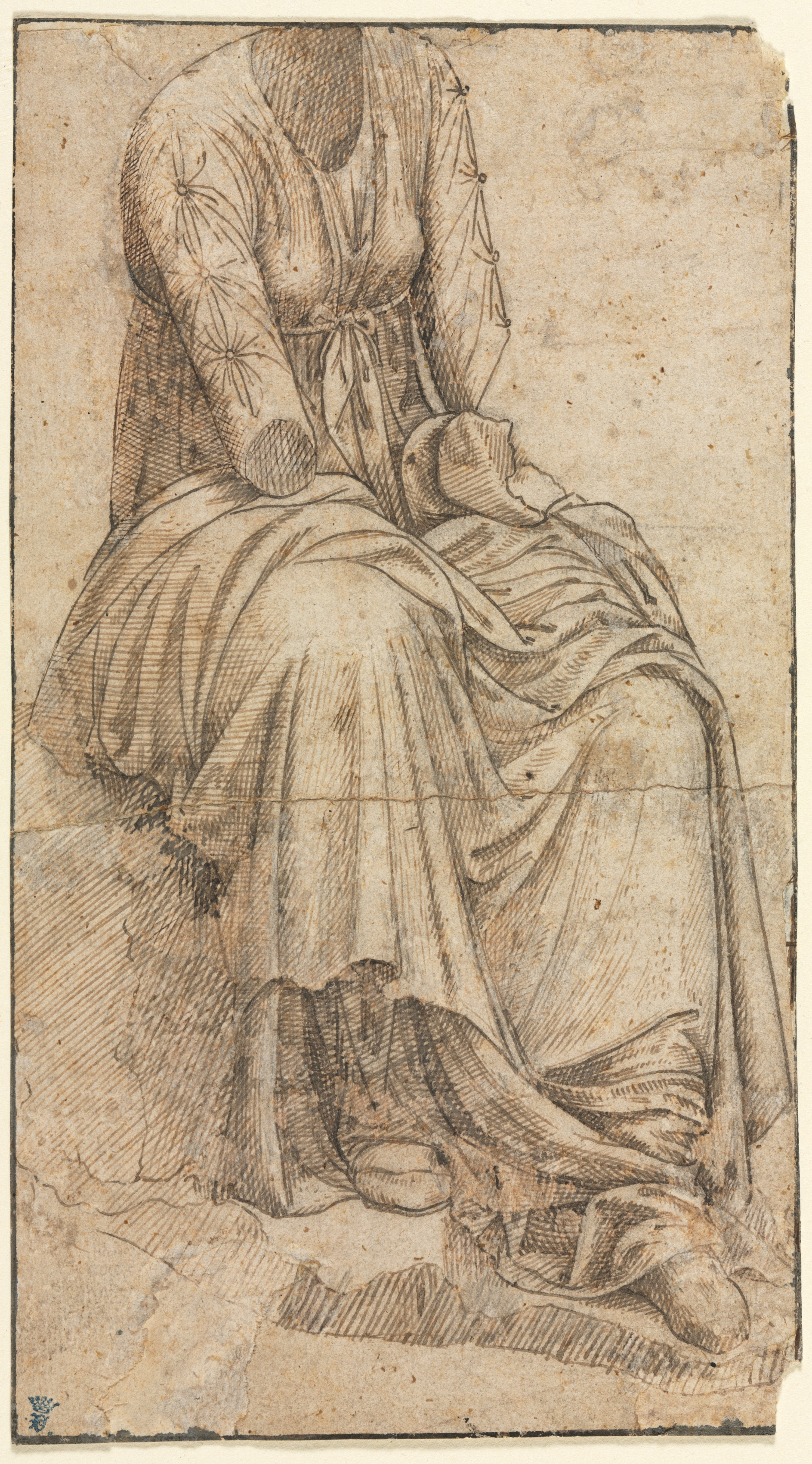 The image depicts a sketch of a woman sitting on a chair or throne-like object. The woman's head and feet are not fully drawn or are cropped. She wears a long dress with a V-neck and long sleeves. A sash cinches at her waist. The dress appears to be made of a flowing material, with folds and creases indicated by lines. The woman sits with her legs crossed and her hands in her lap. The sketch is drawn in black on aged paper with visible discoloration and stains. The drawing style is detailed with cross-hatching. The woman's attire and posture suggest a classical or historical influence.