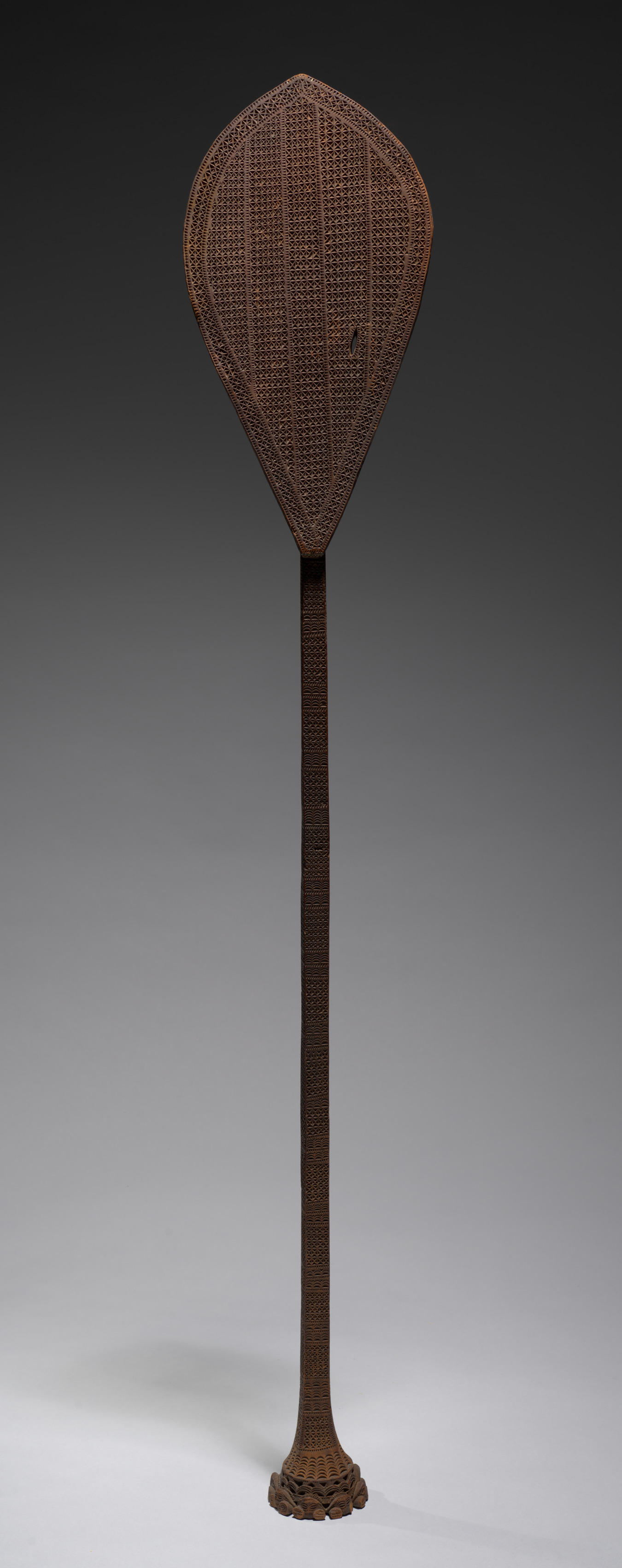 Brown ceremonial paddle with a teardrop-shaped head; head and handle covered in woven material; handle narrow and tapering with a wider base; handle and head connected at a small neck; base of handle with carved decorative edge; background transitioning from dark at top to light at bottom. Ceremonial Paddle by Northwest Coast artist.