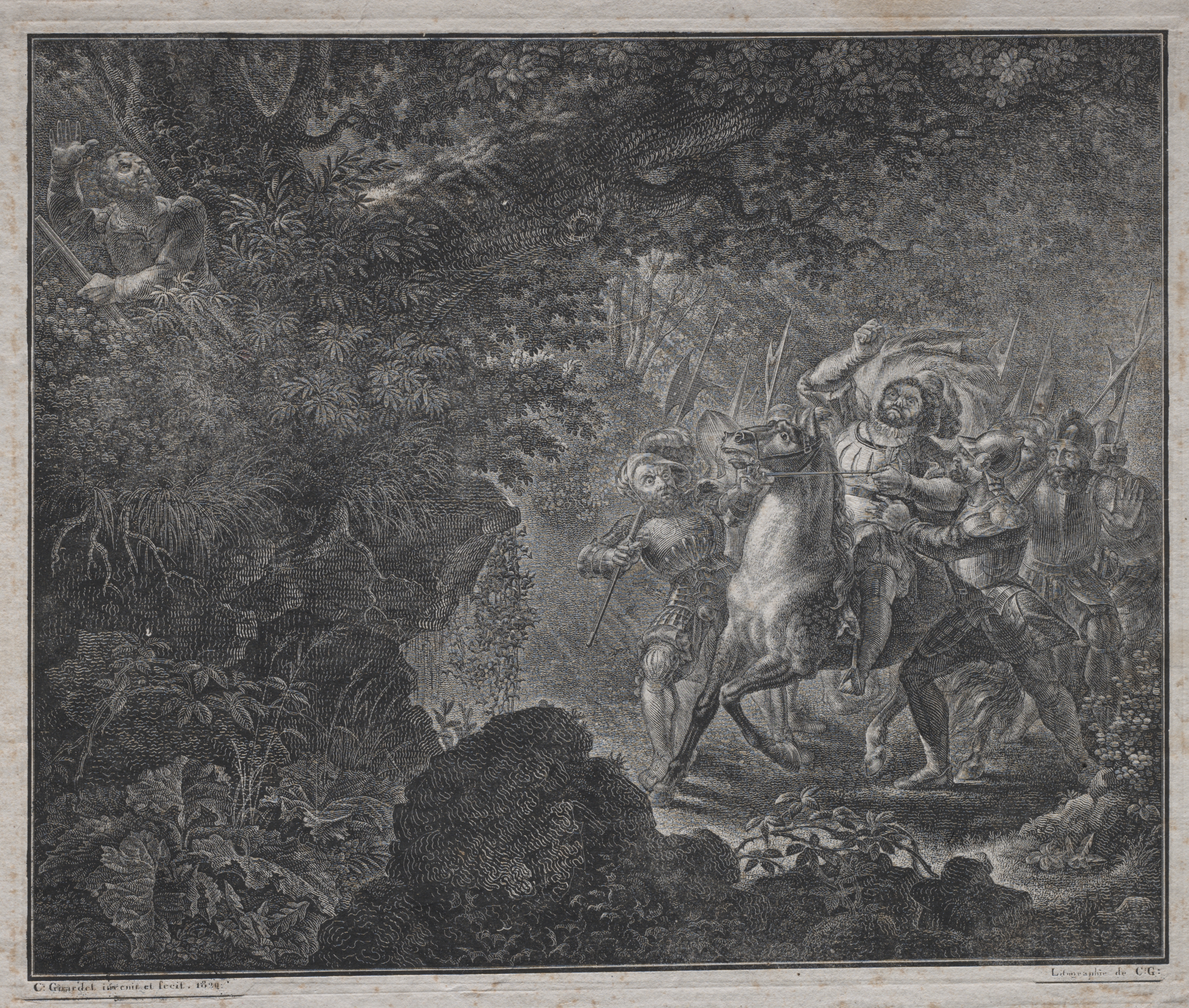 Black and white image of a man on horseback with 4 other men on foot surrounding him in a forest. The man on horseback wears a large hat, tunic and boots. The men on foot wear helmets, tunics and carry spears. Lush vegetation and trees fill the background. A figure with a bow and arrow is visible on a tree. A serpent-like creature is on a tree branch. The artwork style appears to be etched or engraved. The image is framed by a thin black line and a beige border.