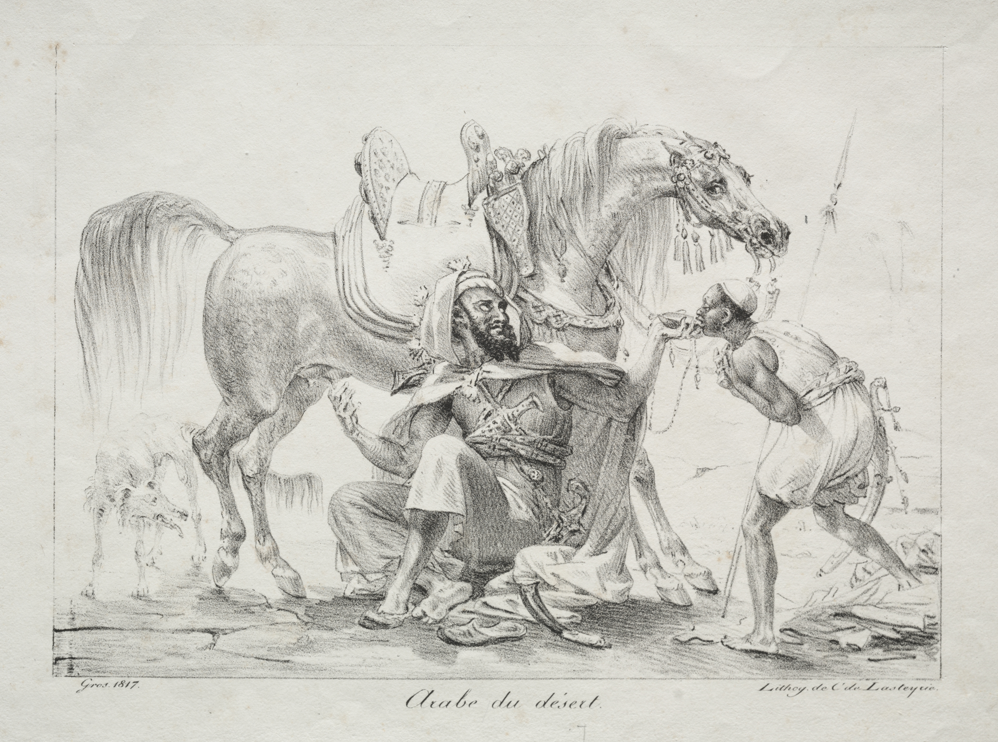 Black and white drawing of a man sitting on the ground with a horse. The man sitting on the ground on one knee has a thick beard and mustache, and he wears a head covering. A man stands to his right and holds the bridles of a horse. The horse has a decorative headpiece and saddle. A dog to the left. The background is minimal. The text "Arab of the Desert" and the artist's name "Antoine-Jean Gros" are written at the bottom.