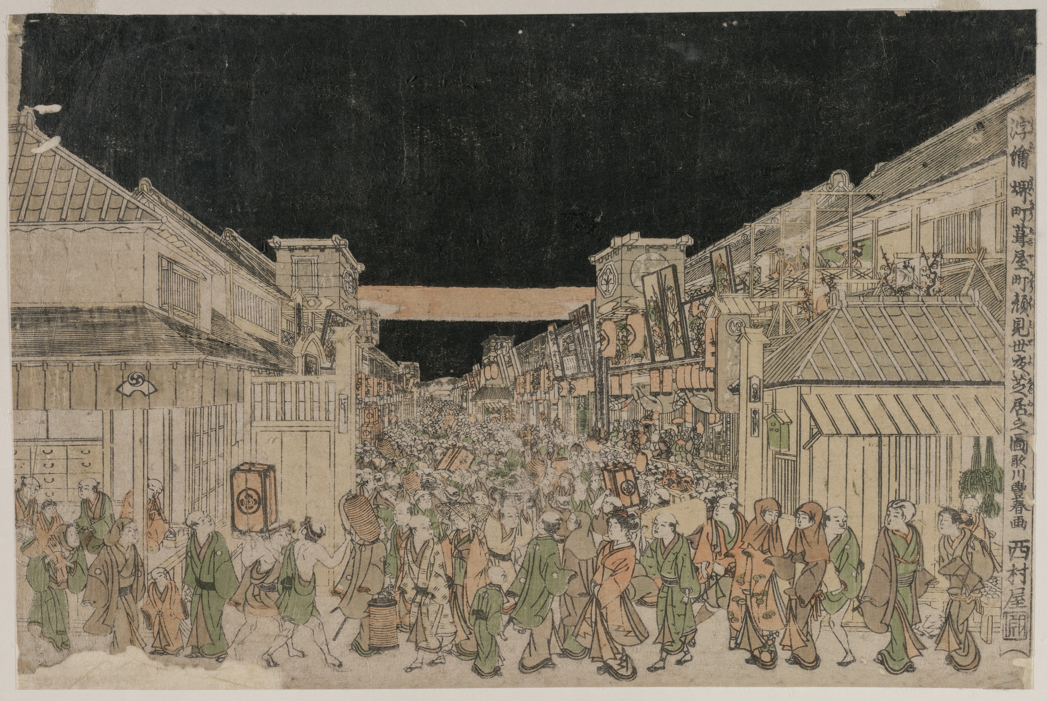 The image depicts a nighttime scene of a street lined with buildings, likely theaters. The street is crowded with people dressed in traditional Japanese attire, including kimonos. The buildings on either side of the street are multi-story and have tiled roofs. Some of the buildings have signs and lanterns hanging outside. The people in the street are walking in both directions, some carrying items such as baskets or boxes. The background of the image is a dark night sky. The overall atmosphere suggests a lively and festive scene, possibly from a traditional Japanese festival or celebration. The color palette is muted, with shades of beige, brown, and green dominating the scene. There are Japanese characters written vertically on the right side of the image.