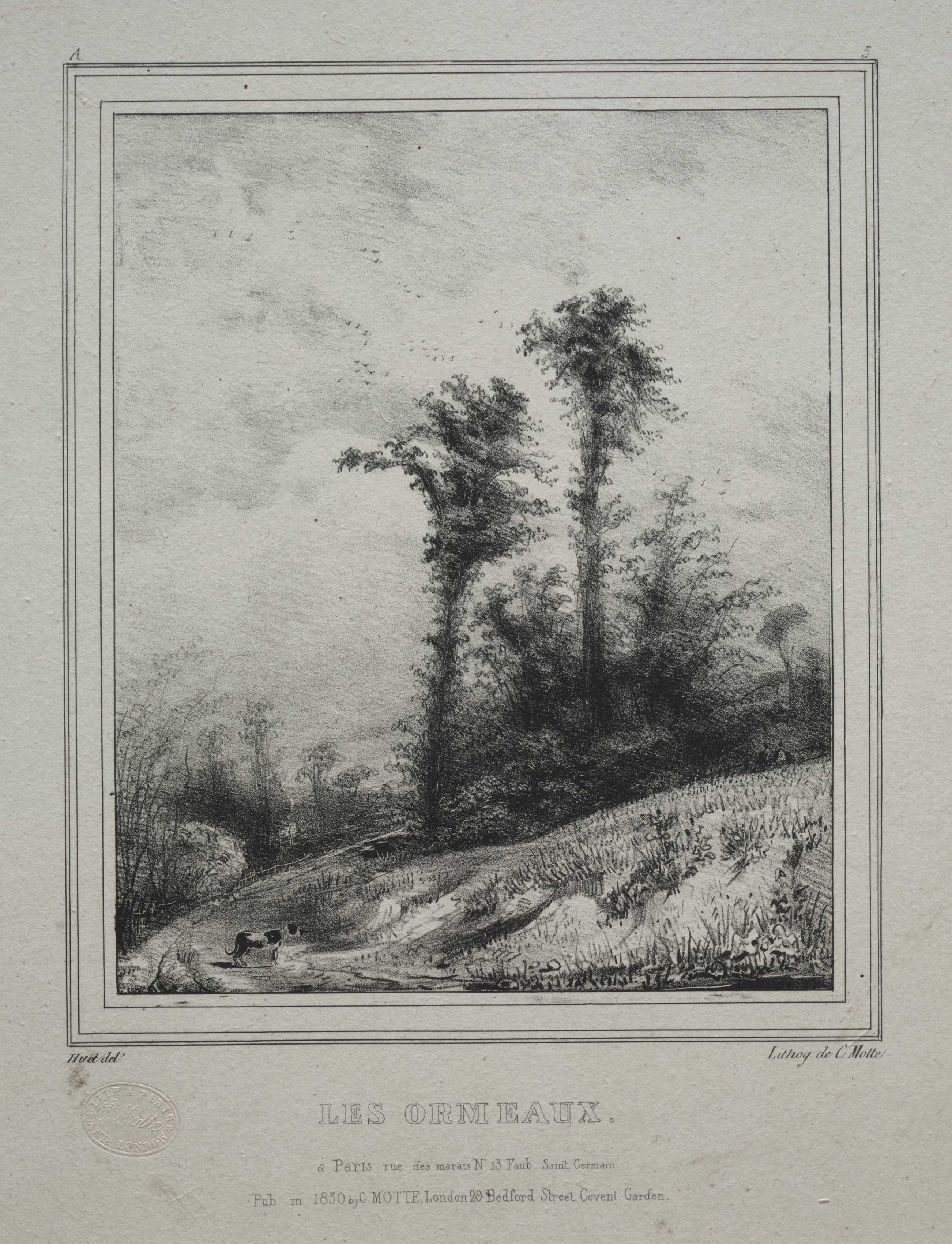 Black and white landscape drawing of a hillside with two young elm trees. The trees are on the right side of the image, on a hill covered in grass and plants. A dirt path leads to the left. The sky is cloudy. The image is in a double-lined rectangular frame. The text "LES ORMEAUX" is printed below the image. Additional small text is printed below.