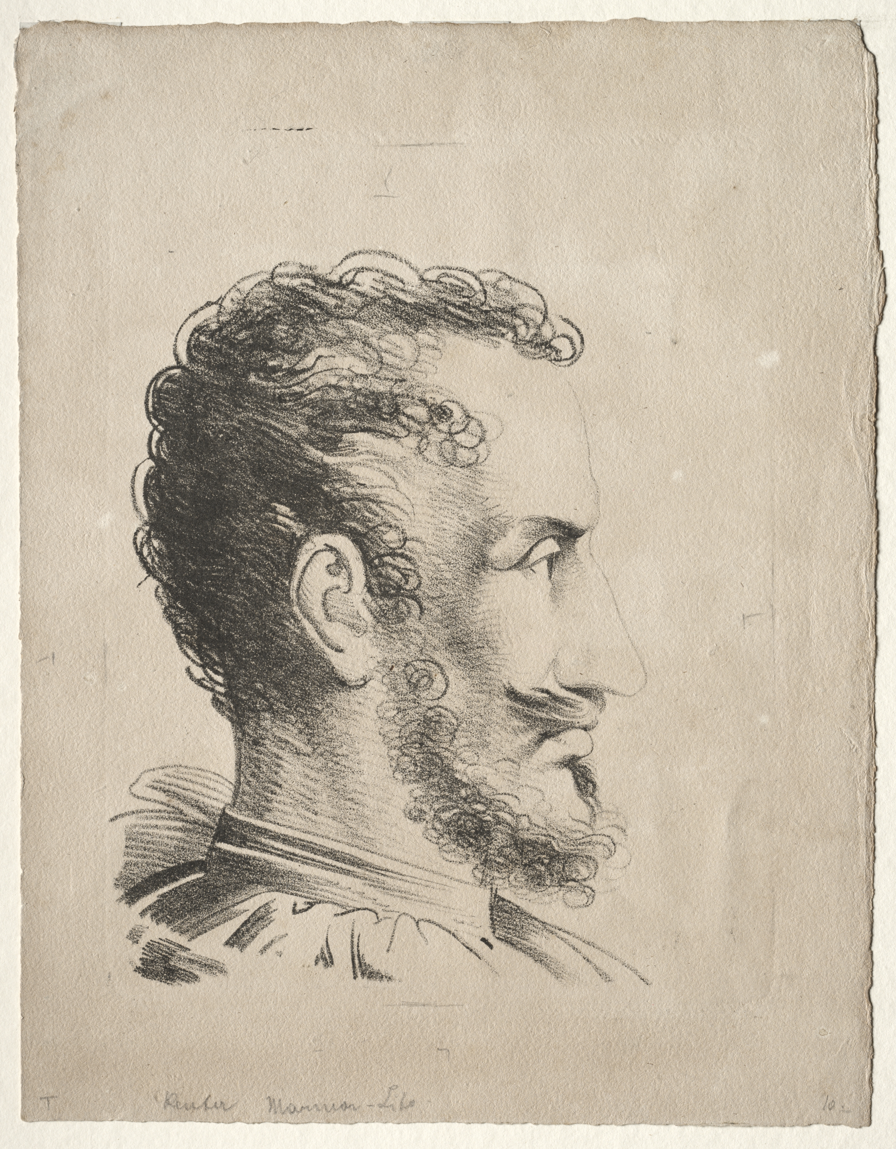 Profile Head by Friedrich Wilhelm Reuter. A black and white sketch of a man's head in profile, facing right. The man has curly hair, a beard, and a mustache. He wears a collared shirt. The sketch is on a beige background with rough edges. The image is in a portrait orientation.