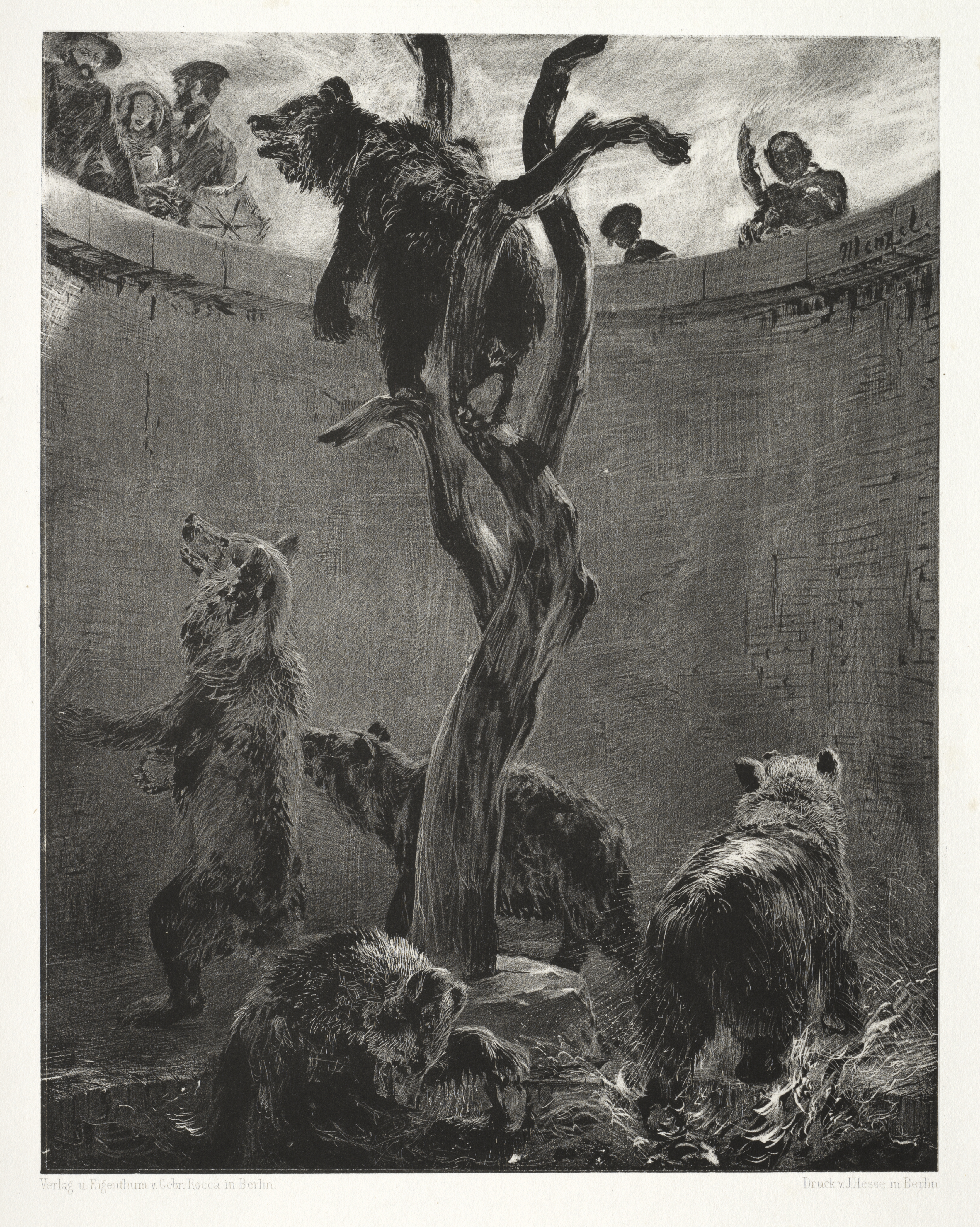 Black and white drawing of a bear standing on a dead tree. The tree sits in the center of a circular pit. Four other bears in varying postures face the tree. Two people on the right lean over a wall in the top right corner. Three people lean over a low wall on the top left.