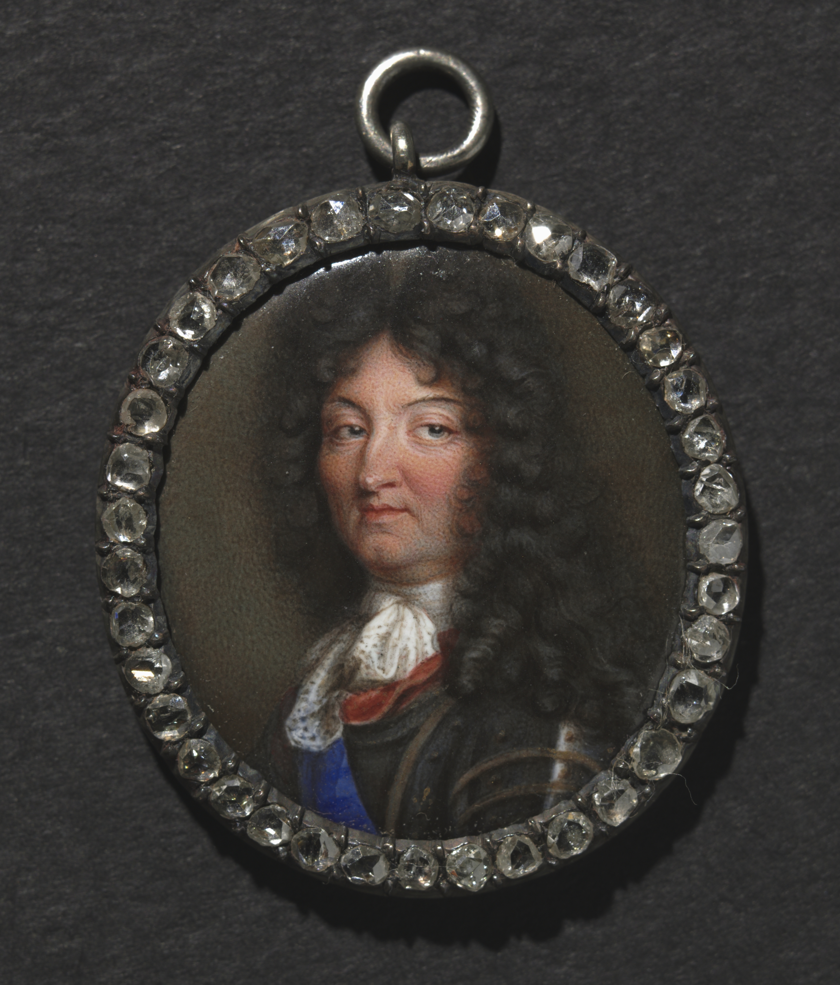 Oval miniature portrait on a pendant with a metal loop at top. The frame is set with clear stones. The depicted man has long, curly dark hair. The man wears a white lace collar with a red and blue garment underneath and a brown jacket with gold stripes. The background of the mini portrait is dark, mottled brown. The pendant rests on a dark grey background.