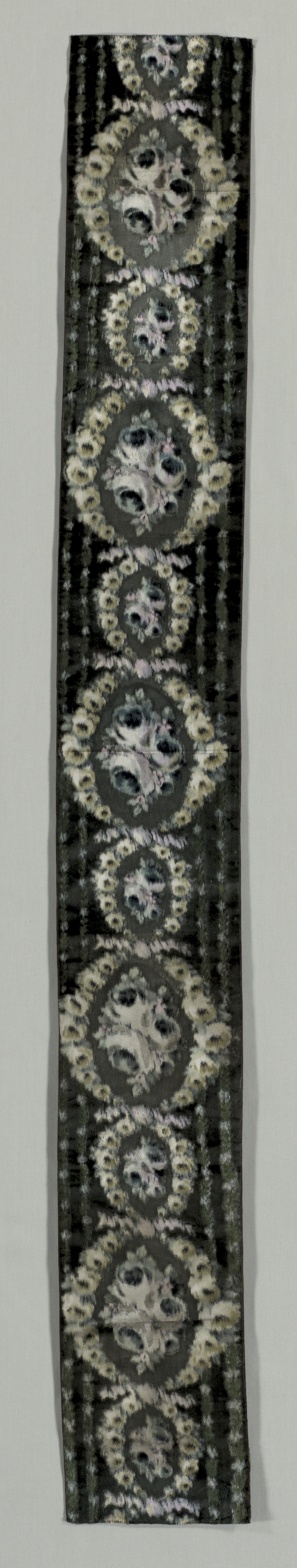 The image shows a long, narrow piece of fabric with a repeating pattern. The fabric is black and white; the design consists of oval shapes with symmetrical patterns. The ovals are arranged vertically in a repeating pattern. The background of the image is a light gray color. The fabric titled "Velourau Sable" is by an unidentified artist.