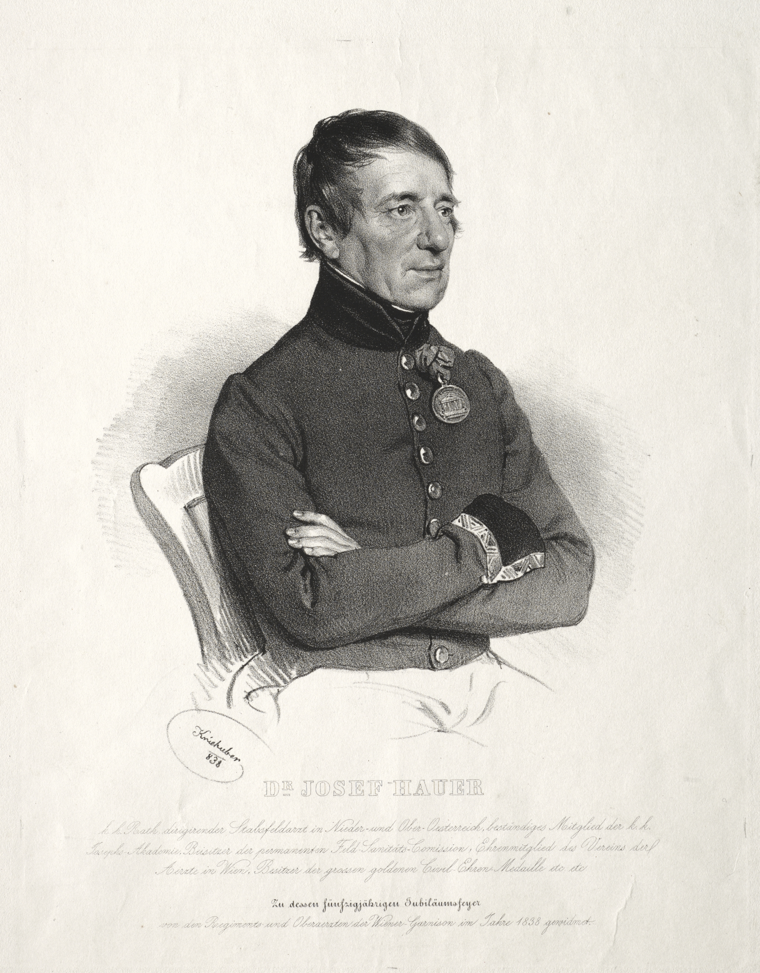 Black and white portrait of a man with dark hair, wearing a dark military-style jacket with high collar, 8 buttons down the front, and a circular medal on the left side. His arms are crossed. He wears white pants. Sitting on a curved back chair. The background is off-white with darker shading behind the man. Text at the bottom reads "Dr. Joseph Hauer" and there is additional illegible cursive text.