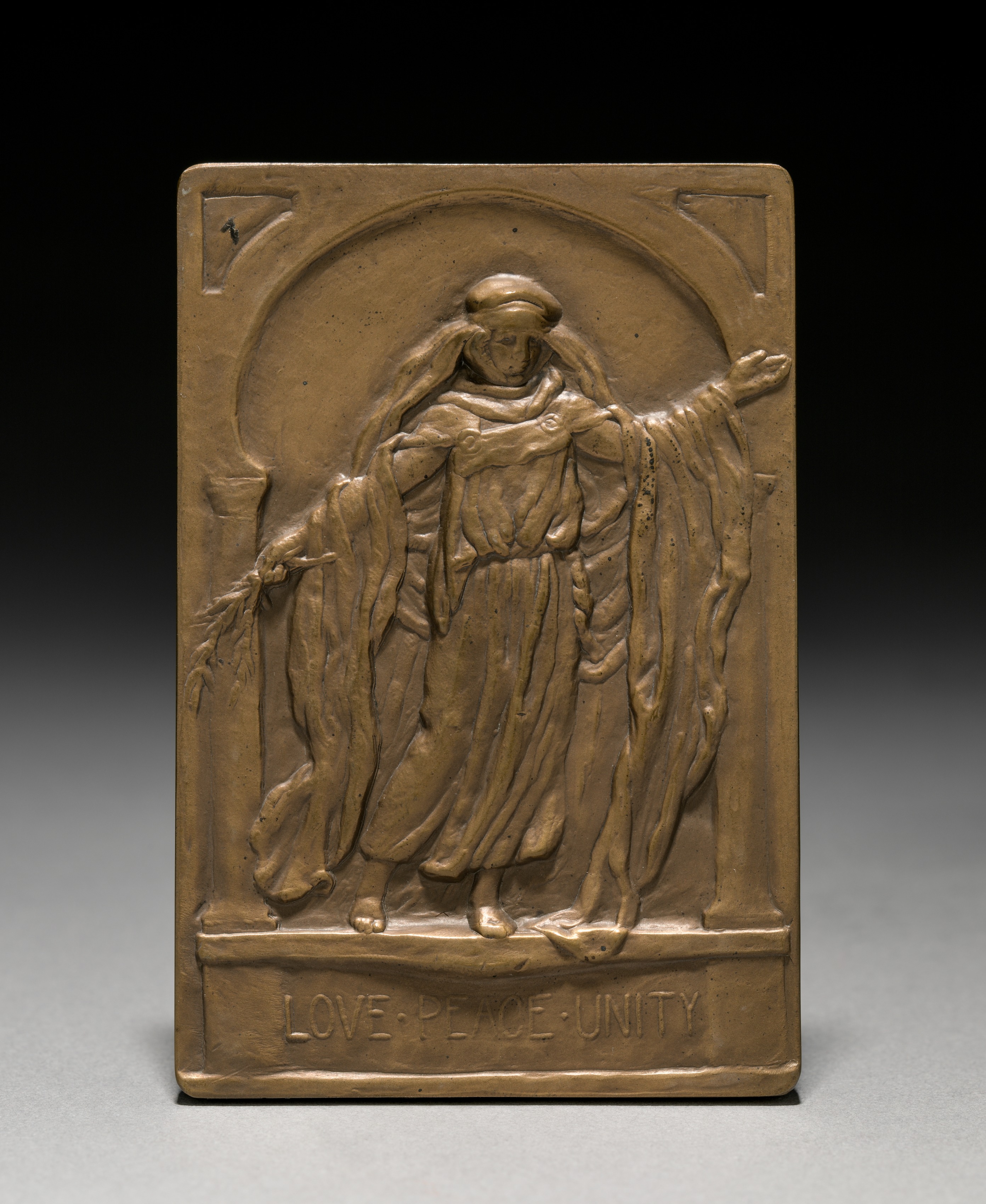 Rectangular bronze medal with raised design. Figure in long robes and head covering centered. Figure holds branch in right hand, left arm outstretched. Words "LOVE PEACE UNITY" on bottom. Figure in front of semicircular background. Small decorative shapes in top corners.