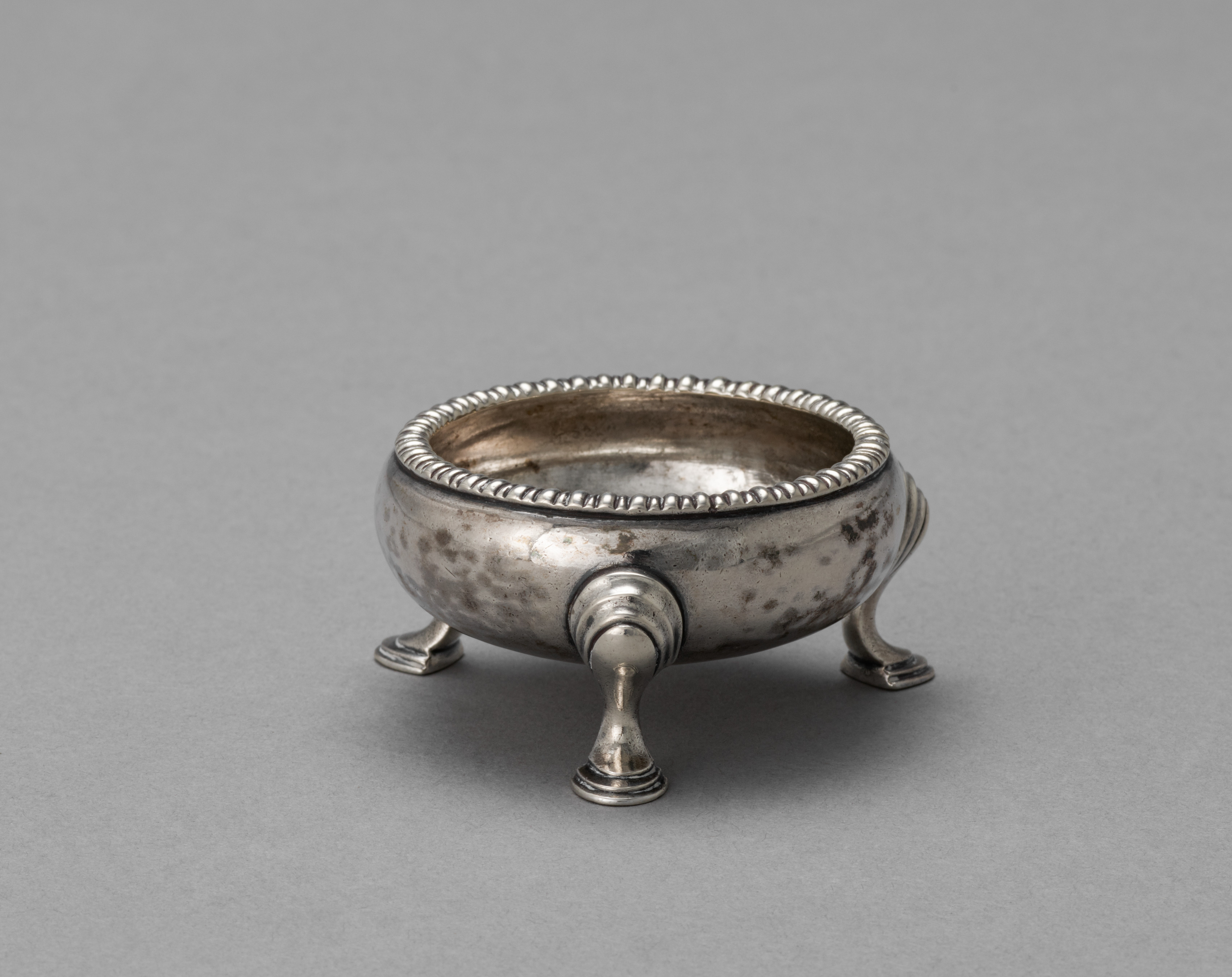 The Salt Cellar by John Andrew is a small, silver-colored metal container. The container has a round body with a wide mouth and a decorative edge around the top. The edge features a series of small, raised bumps. A spout protrudes from the front of the container, near the bottom. The container has three short, curved legs. The surface of the container is tarnished, with darker spots and discoloration visible. The background of the image is a plain gray color.