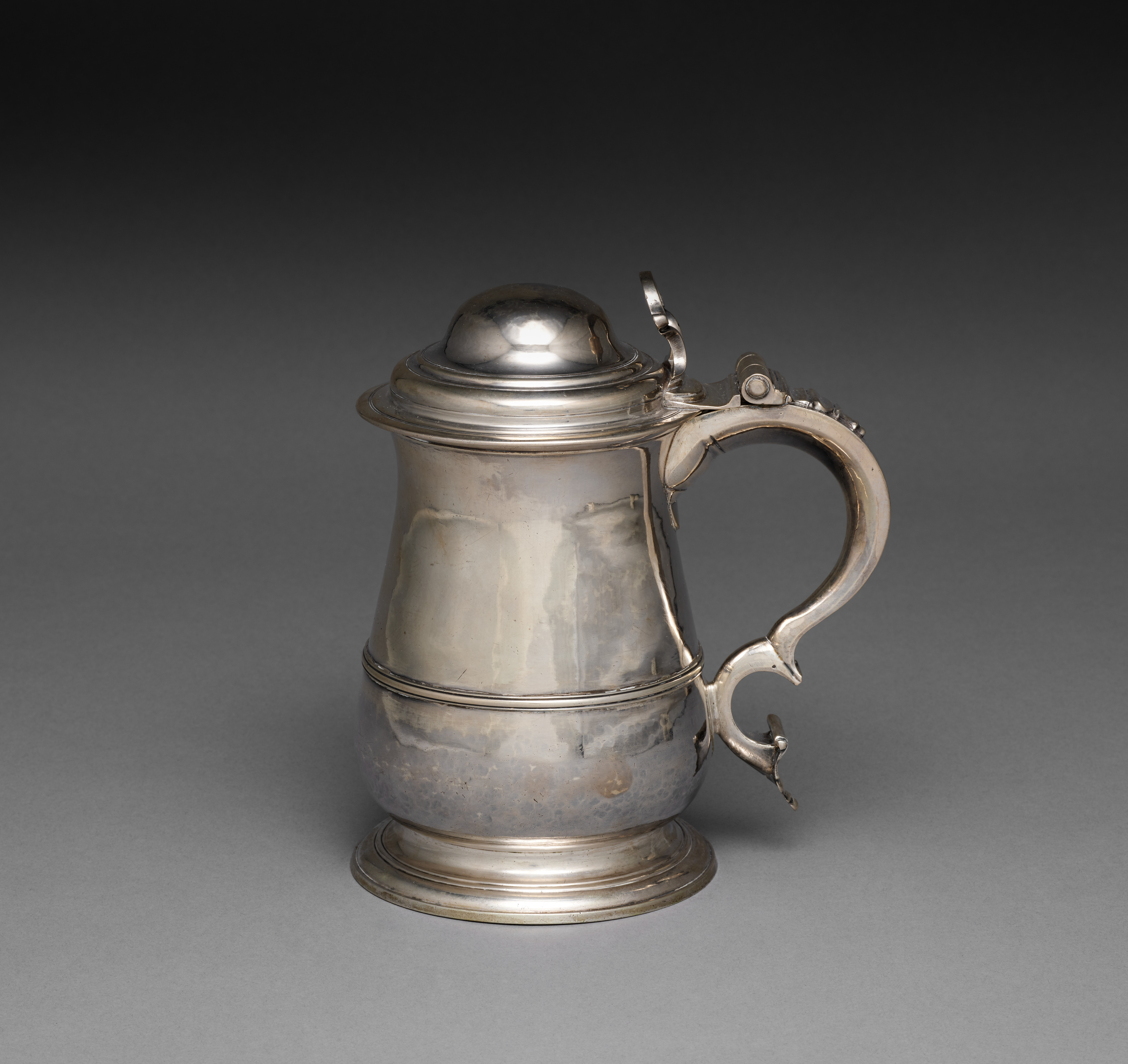 Silver-colored metal tankard by artist Tankard; rounded body with a slightly flared base, a narrow middle section that widens towards the top; handle on the right side, attached to the body and the lid; domed lid with a small finial; reflective surface with some tarnish; set against a gray background.