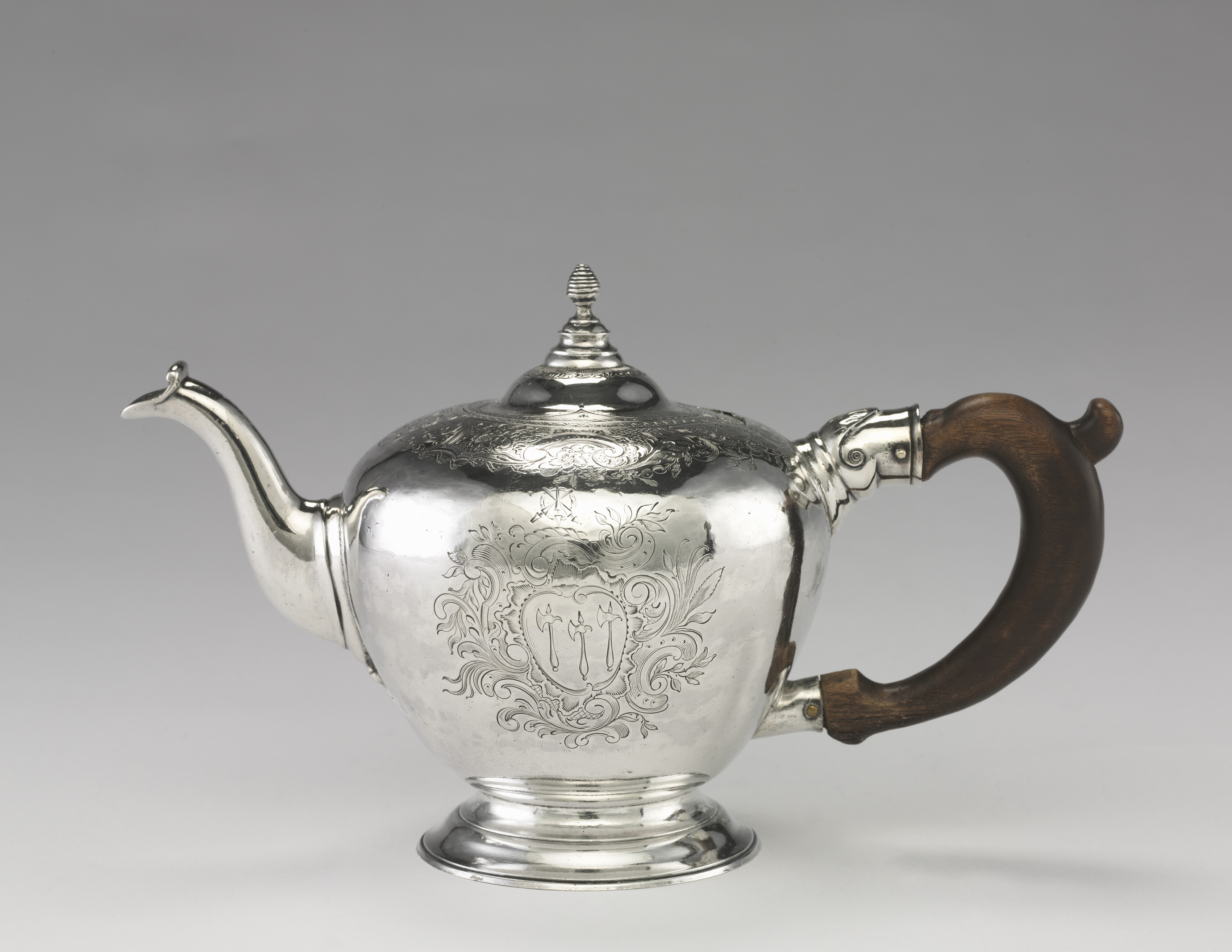 Silver teapot with a rounded body and a short, curved spout. The teapot features an engraved design on its body, consisting of a shield surrounded by floral patterns. The handle is made of dark brown wood and attached to the teapot with silver fittings. The lid is rounded and topped with a small, pointed finial. The background of the image is a gradient of gray, transitioning from light to dark. The teapot sits on a white surface. Created by Nathaniel Hurd.