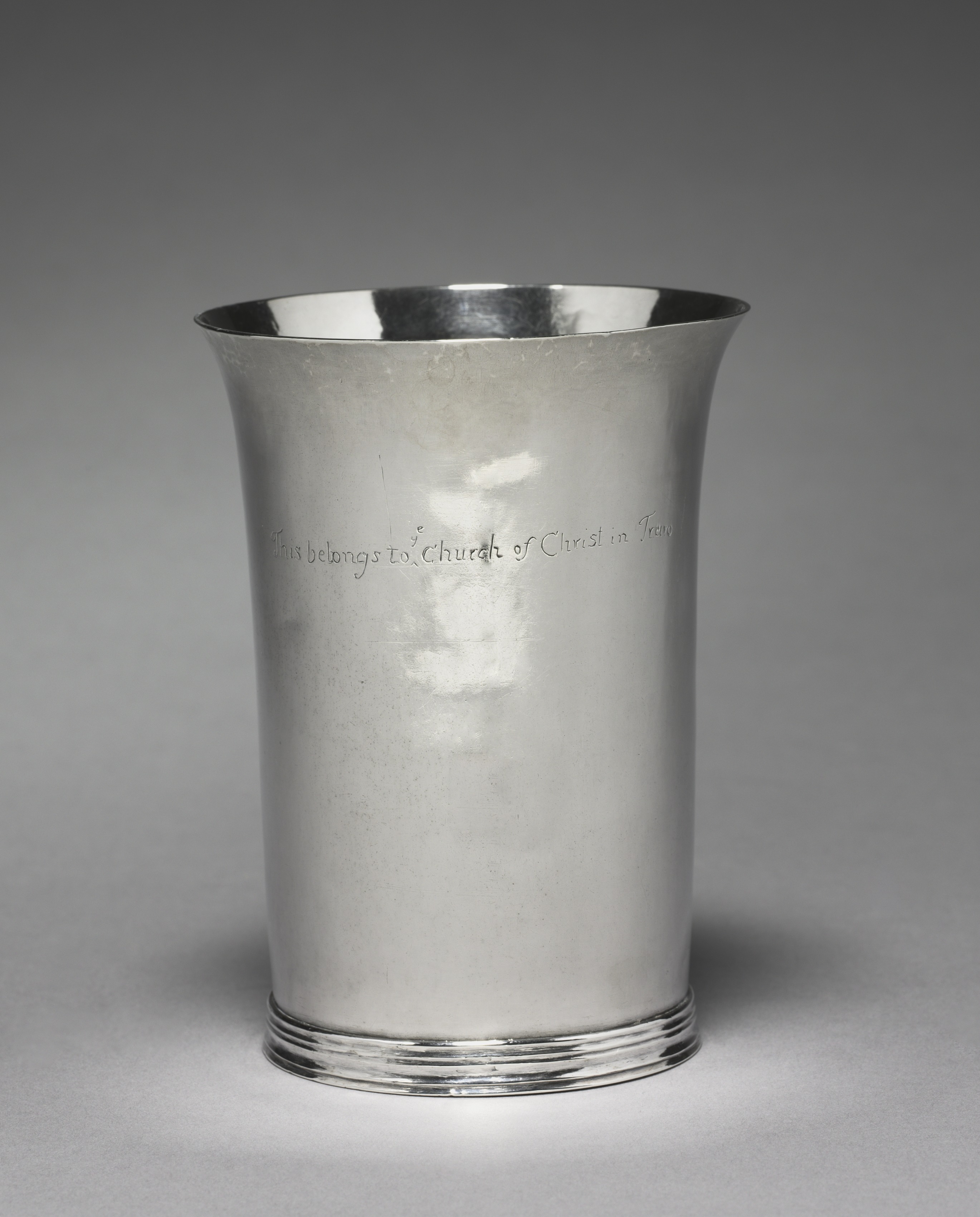 Beaker by Moody Russell: A tall, silver-colored metal beaker with a flared mouth and a flat base featuring three raised rings around the bottom, the beaker has a shiny interior and exterior surface with visible scratches. The side of the beaker has engraved text reading, "This belongs to Church of Christian Faith". The background is gray with a shadow cast by the beaker.