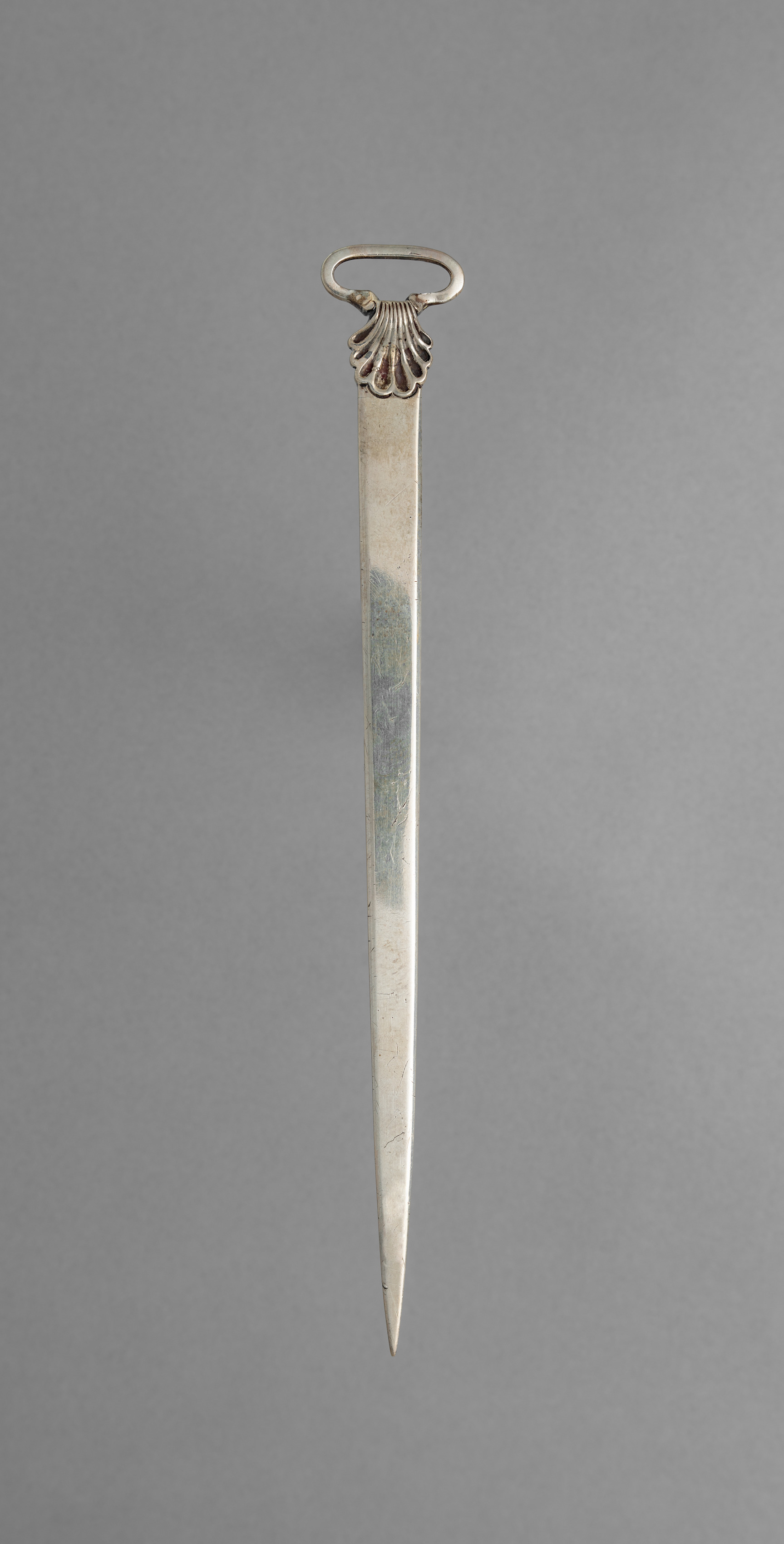 The image depicts a metal skewer titled "Skewer" by an unknown artist. The skewer is made of metal, likely silver or silver-plated, and has a long, thin, pointed blade with a sharp tip. The blade is narrow and tapers to a point at the bottom. At the top of the blade, there is a decorative element that resembles a shell or a flower, with a series of curved lines that radiate from the center. Above this decorative element is a small, circular loop, possibly for hanging. The background of the image is a plain gray color, providing a neutral backdrop for the skewer.