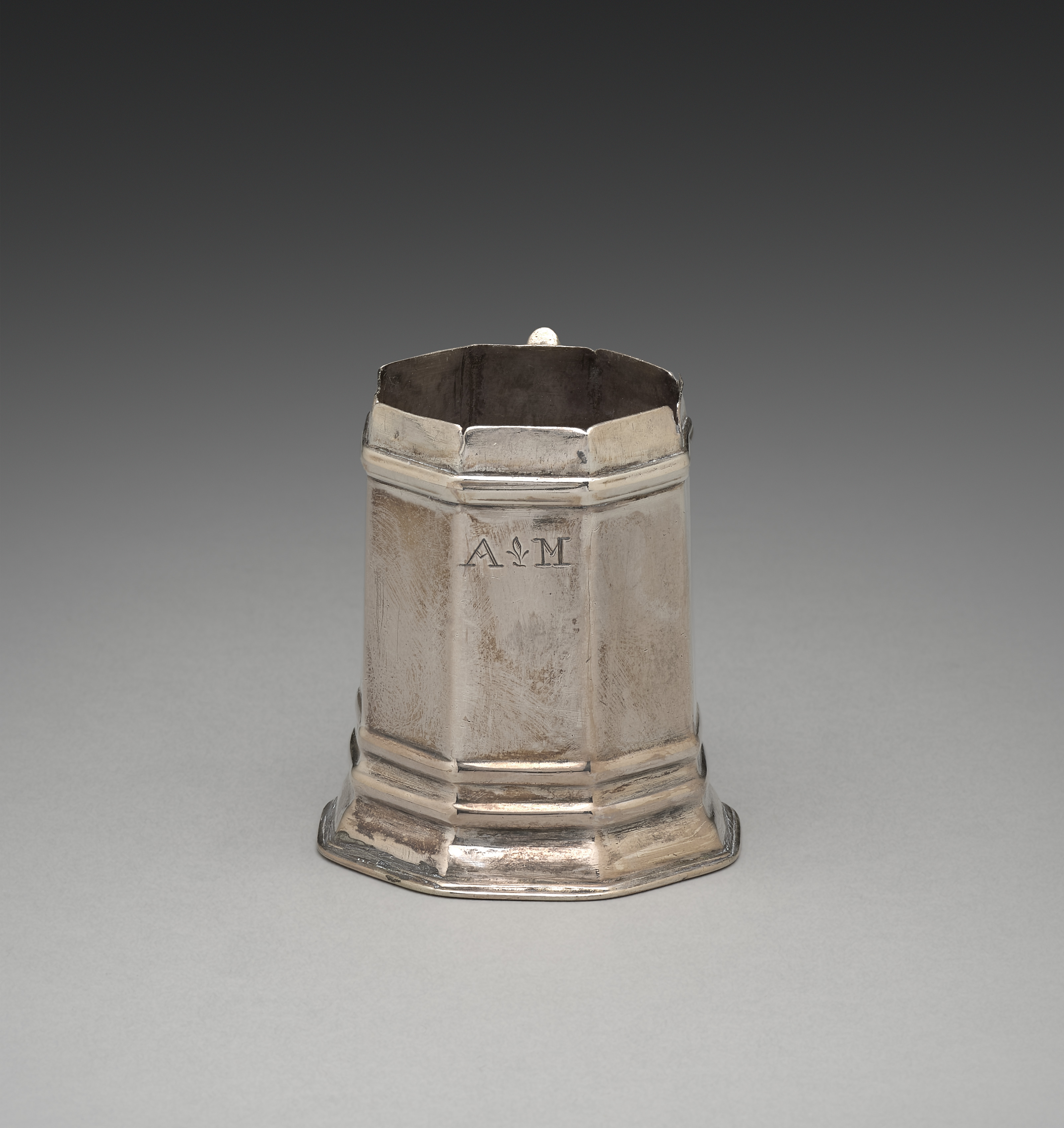 The Caster by Andrew Tyler: A silver-colored metal object with a wide base and a narrower top, having a rounded knob on the top rim; eight sides with horizontal ribbing at the bottom; engraved letters "A M" with a leaf between them; a dark gray gradient background transitioning to light gray.
