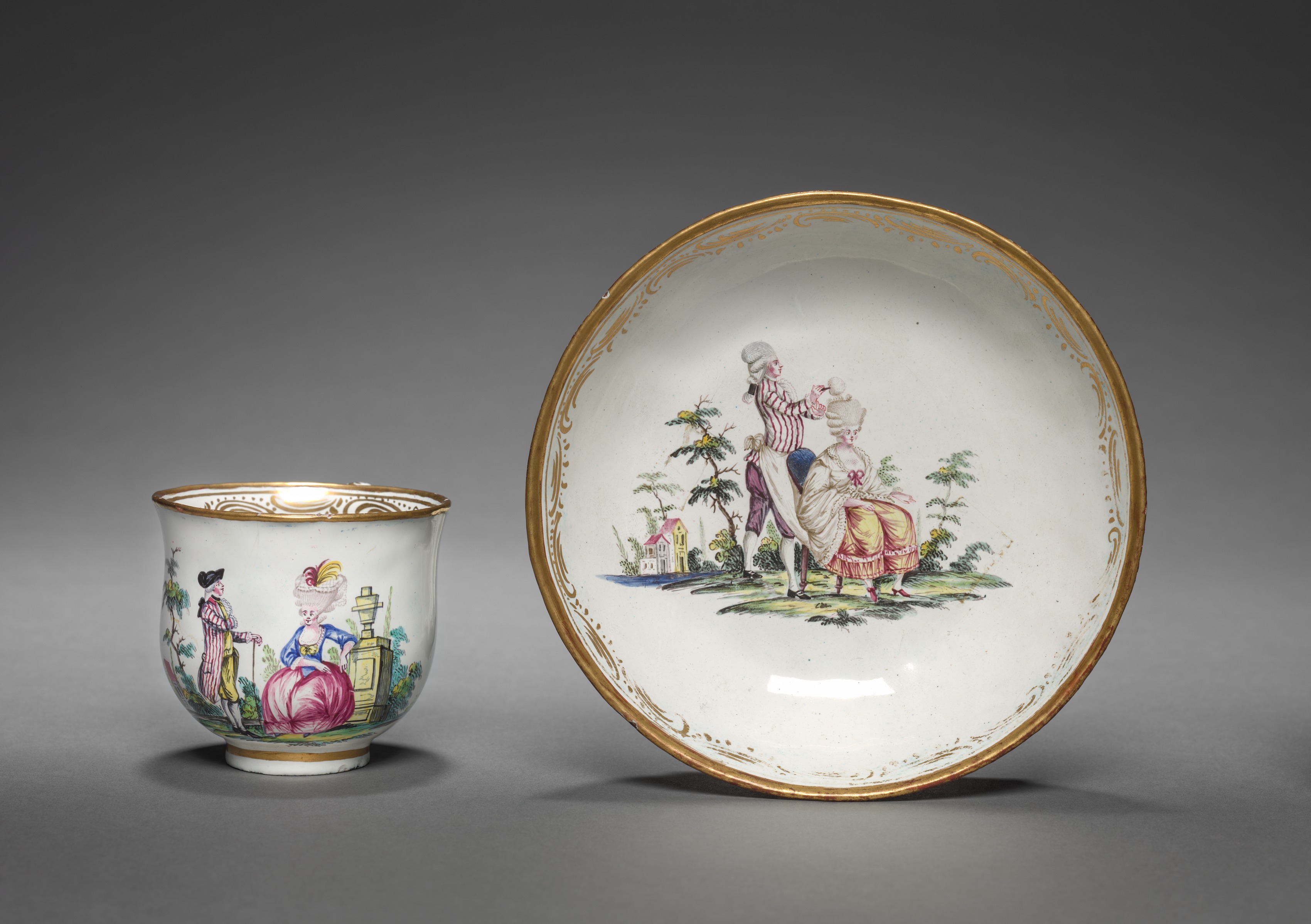 The image shows a white porcelain cup and a matching saucer. The cup is on the left and the saucer is on the right. The cup has gold accents around the top rim and base. The saucer has gold accents around the rim. The cup and saucer feature colorful illustrations of people in 18th-century clothing. On the cup, a woman in a blue dress and a man in a striped shirt are standing on the left side. On the saucer, a man and a woman are standing in a grassy area with trees and a house in the background. The man on the saucer is wearing a pink and white striped shirt, blue pants and a white hat; he is holding an object to the face of the woman. The woman on the saucer is wearing a pink and yellow dress. The background of the image is gray. The image features the title "Cup and Saucer".