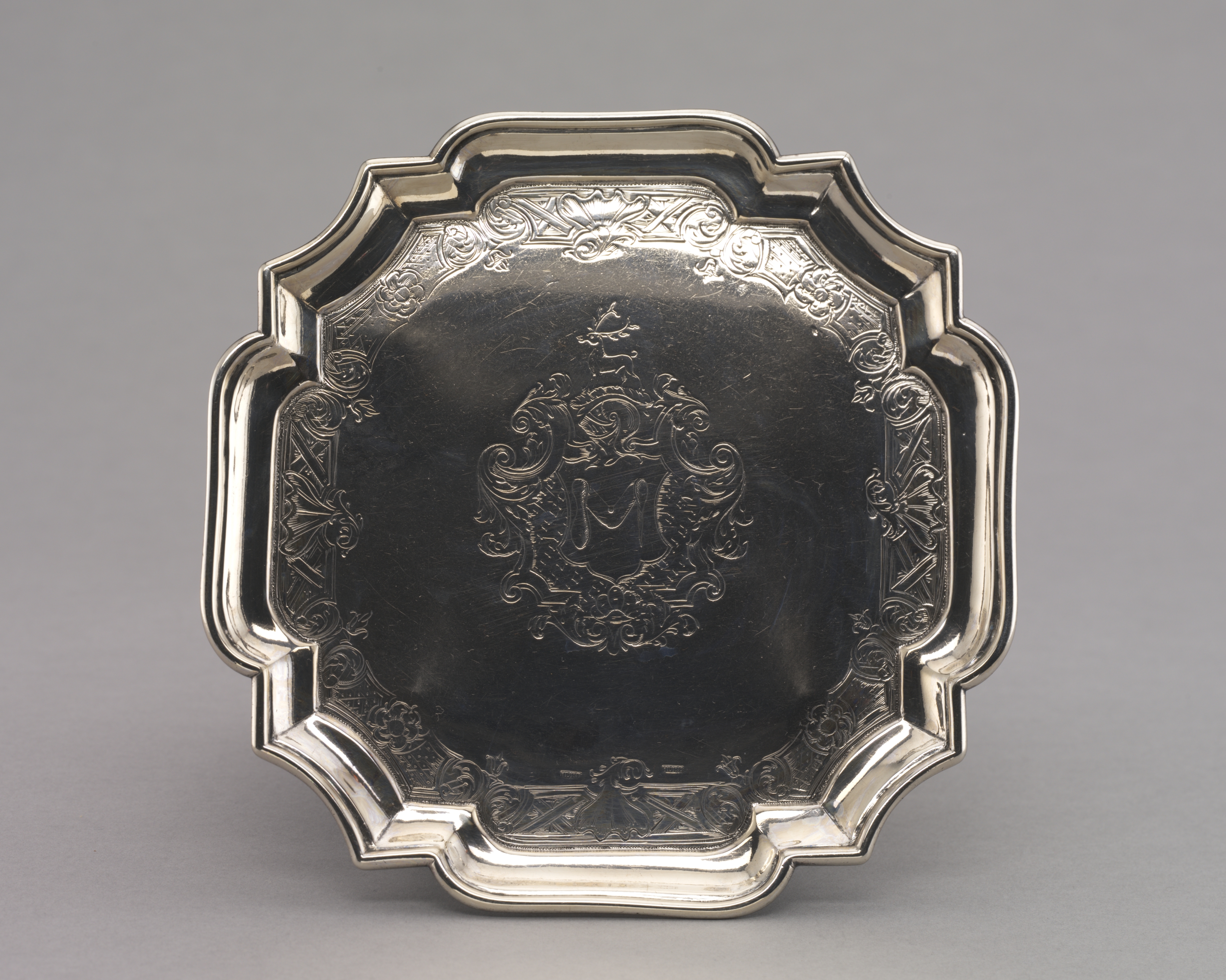 Salver by Jacob Hurd. A silver tray with a scalloped edge and ornate engravings. The tray is shaped like an irregular octagon. The engravings include a large monogram in the center. The border features floral patterns and scrollwork. The tray has a raised edge and a flat bottom. The surface shows signs of wear and scratches. The background of the image is gray.