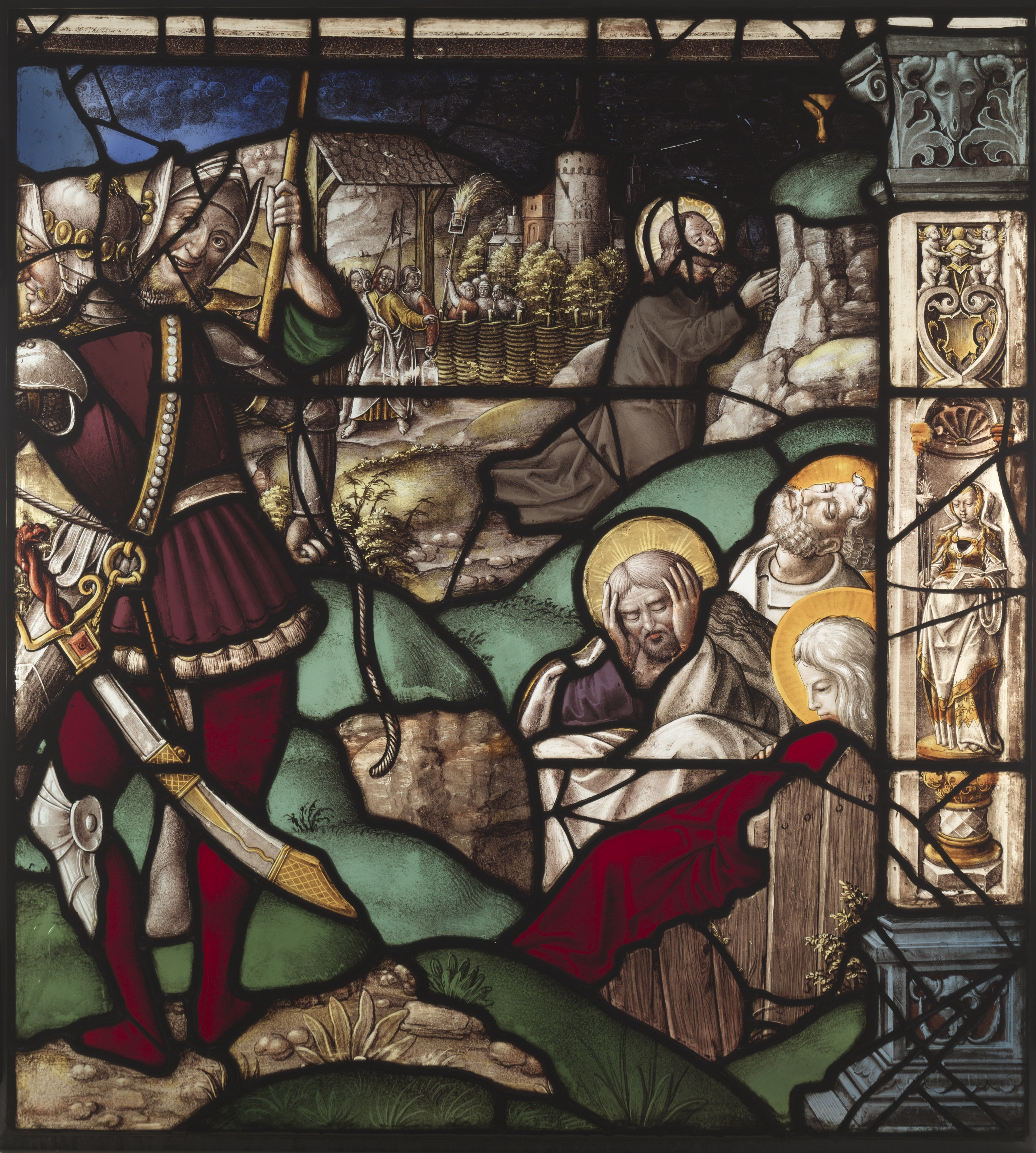 Stained glass window depicting Christ in the Garden of Gethsemane. The scene shows Christ kneeling in prayer with three apostles nearby. Christ wears a white robe and has a halo. The apostles are also haloed, one with hands on his face, another standing behind, and a third sitting on a red cloth. On the left, a soldier in armor with a red tunic, red pants, and a green cape holds a staff. The soldier wears a silver helmet with a nose guard and a large sword at his side. Behind the soldier, a crowd of people and a building with a tower are visible. To the right, a stone column features decorative carvings and a statue of a woman. The background includes a blue sky with clouds and greenery on the ground. The entire scene is framed in black. The stained glass artwork is by Everhard Rensig and is titled "Christ in the Garden of Gethsemane".