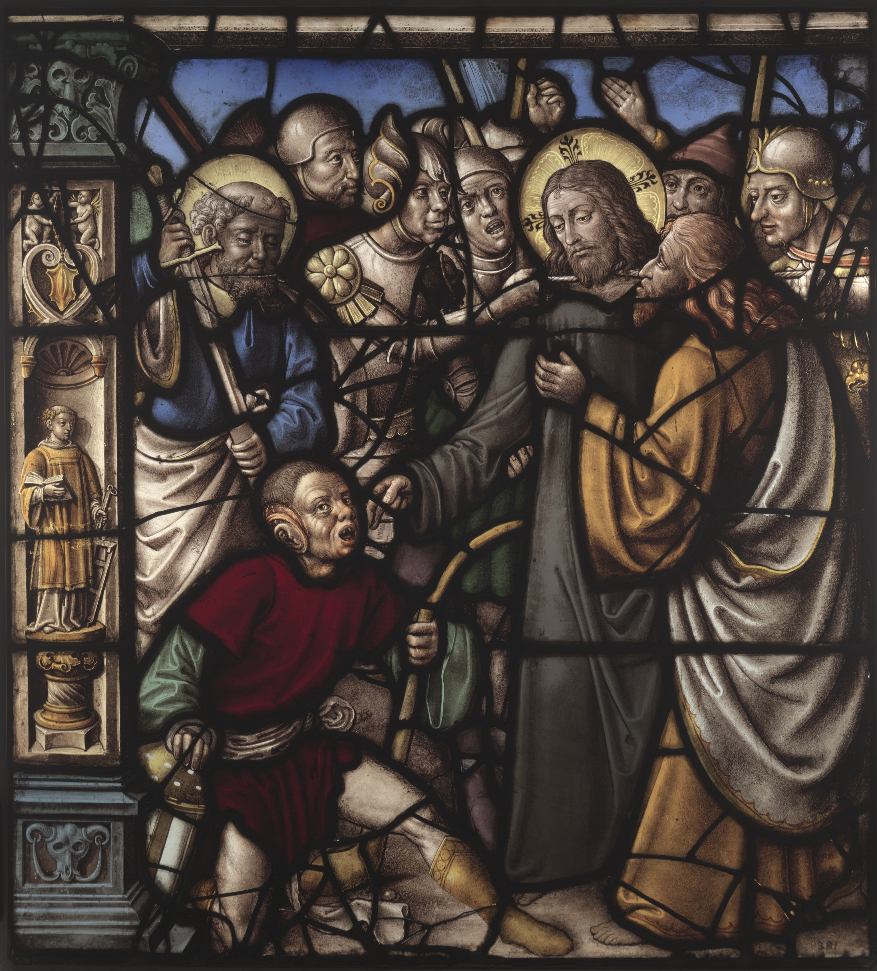 The Kiss of Judas by Everhard Rensig: A stained-glass artwork depicting a biblical scene. The artwork shows a group of men surrounding a central figure who has a gold halo. The central figure wears a long dark robe and a white cloth over his left shoulder. He stands facing right. He is surrounded by several men, some wearing armor and helmets. One man on the left has a blue and white robe and holds a sword. Another man on the left crouches slightly bent forward; he wears a red tunic over a green shirt and white shorts. The crouching man wears a white cloth wrapped around his waist. The crouching man holds a lantern in his right hand. The background includes a blue sky and a stone wall on the left. The stone wall on the left has a decorative pattern. A small figure stands on a pedestal on the left wall. The small figure on the pedestal wears a yellow robe. The small figure on the pedestal holds a book and a sword.