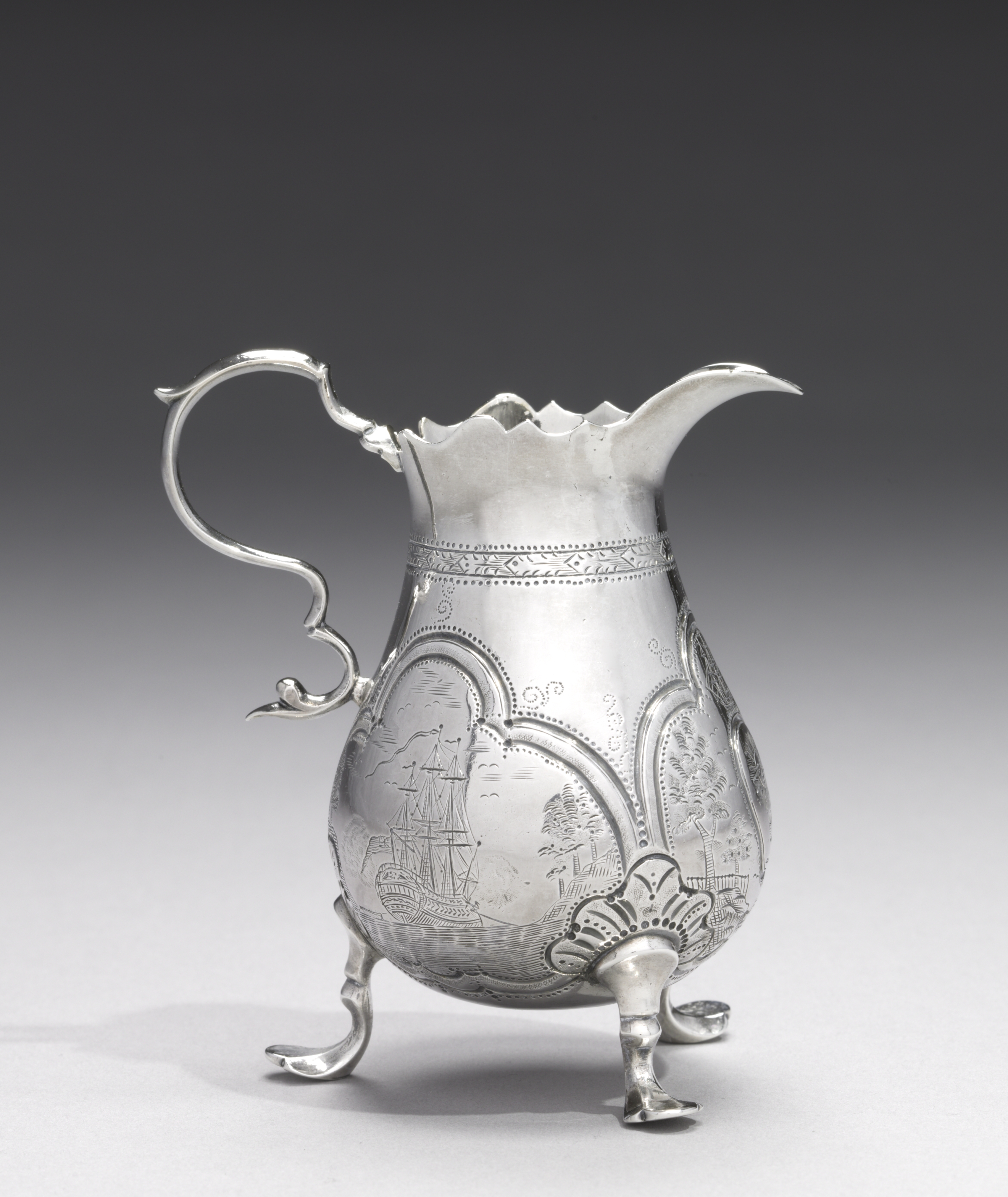 The image shows a silver cream jug titled "Cream Jug by Jacob Hurd". The jug has a spout and a handle on one side. The body of the jug is bulbous, sitting on three legs. The jug has an engraved design featuring a ship and other scenery. The top of the jug and below the engravings has a band of engraved line patterns. The background of the image is a dark gray gradient that lightens towards the bottom.