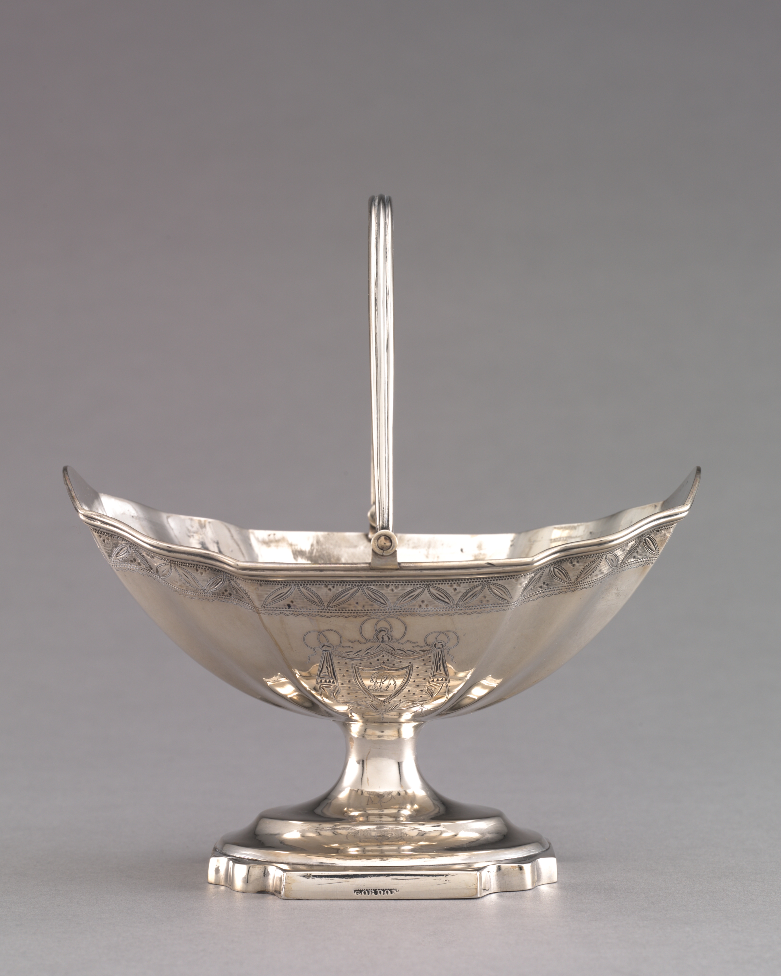 The image depicts a silver basket with a long handle by Andrew Gordon titled "Sugar Basket". The basket has a wide, shallow body with a wavy edge and decorative etchings around its interior. The basket's body is supported by a short, thick stem that widens into a base with a square shape and rounded edges. A long, slender handle extends from the center of the basket, attached at the base of the handle and the interior of the basket. The background of the image is a gradient gray color, transitioning from light to dark. The basket sits on a light gray surface. The basket is made of silver-colored metal, exhibiting a reflective surface with visible signs of wear.