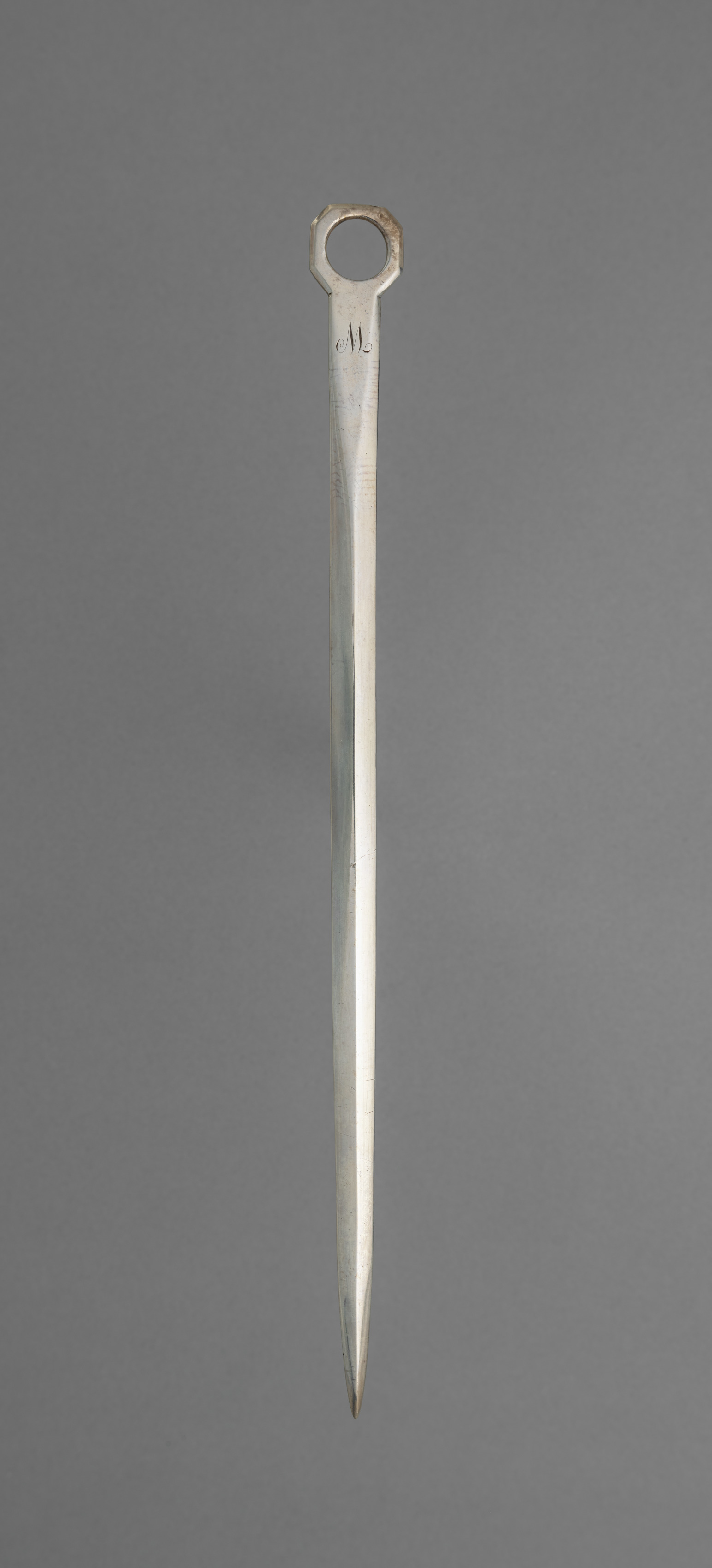 Skewer by M, silver skewer with a long, thin, tapered metal body, circular handle at one end, gray background.