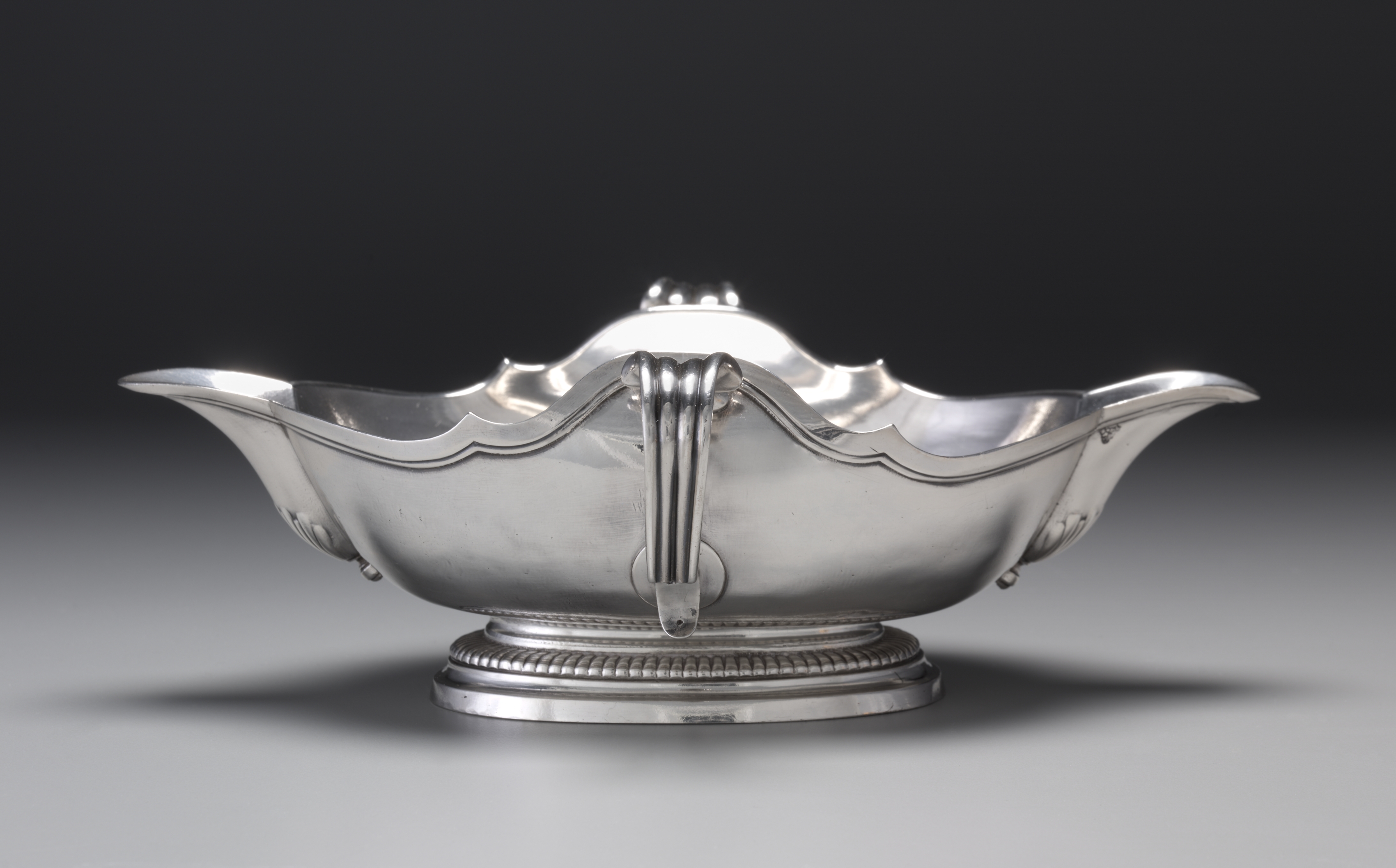 The image depicts a silver sauce boat by Nicolas Duclos. The sauce boat is silver and shiny with a wavy edge around the top. It has a handle in the front and a small finial on top. The base is round with a decorative edge. The sauce boat has two spouts on either side, one near the front and one near the back. The background is dark gray at the top and light gray at the bottom. A shadow is cast by the sauce boat onto the surface below it.