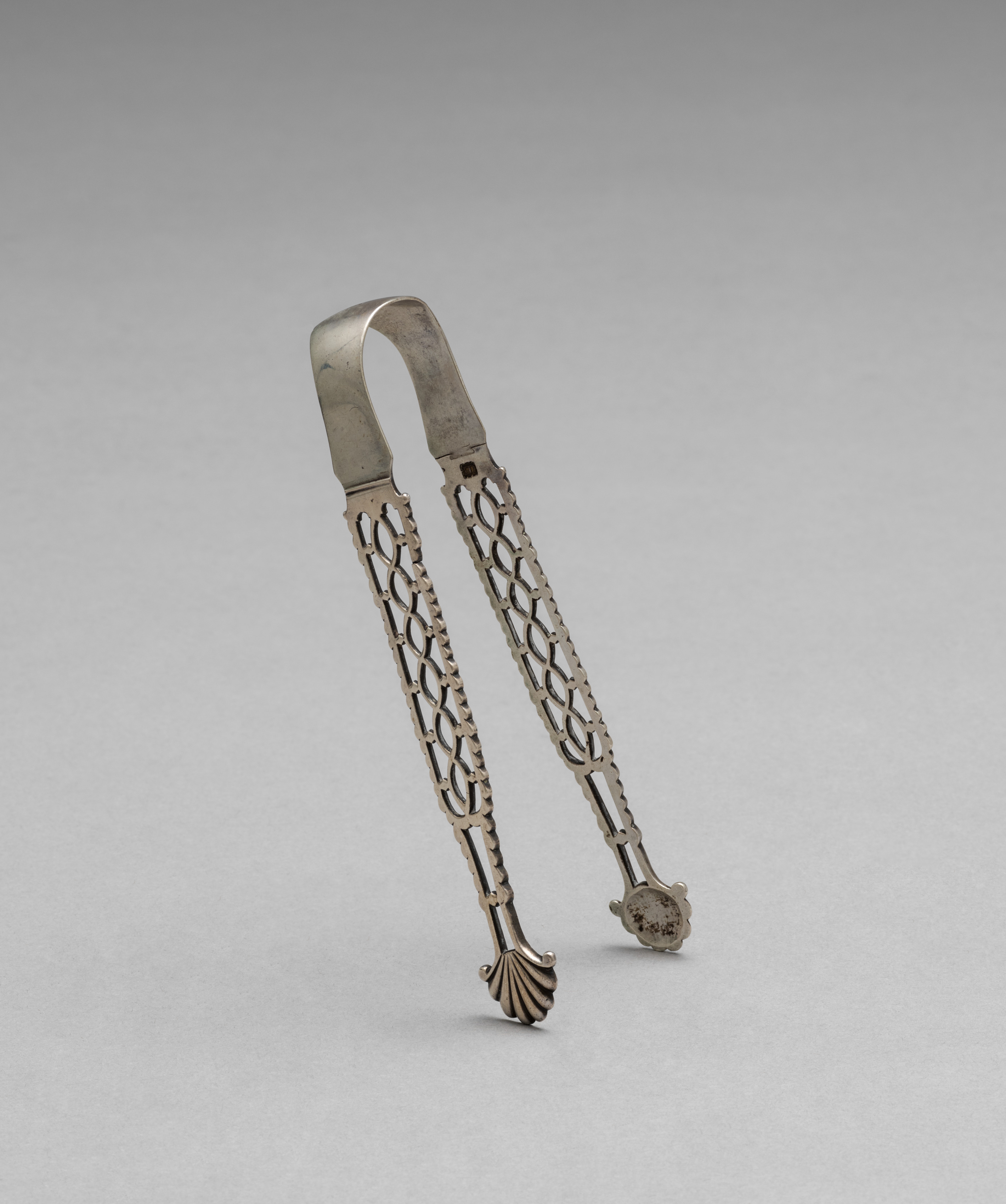 Metal tongs with a silver or gray color; handles have a latticework design and terminate in a shell-like shape on one end and a ball-like shape on the other.