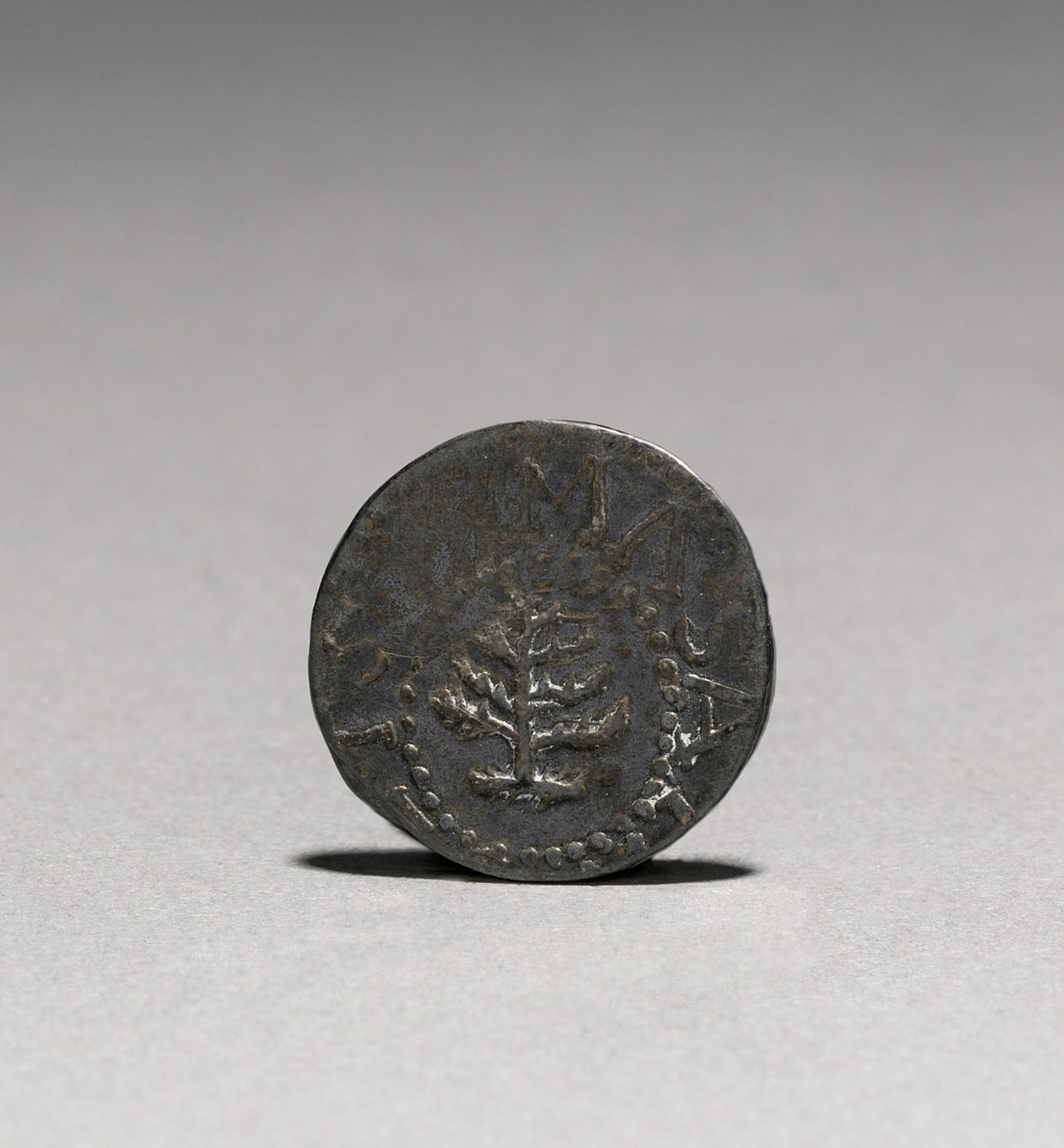 The coin displays a tree with a short trunk and a small number of branches, positioned centrally. The coin's surface exhibits a dark coloration with visible signs of aging and wear. The tree design features a short, thick trunk that splits into several branches. The coin is circular in shape. The background of the image is a plain gray surface. The coin casts a small shadow on the surface below it. The coin appears to be made of metal. There are raised edges and details on the coin. The coin is standing on its edge. Some letters are visible on the coin, but they are not legible. The coin has a beaded border along the bottom edge.