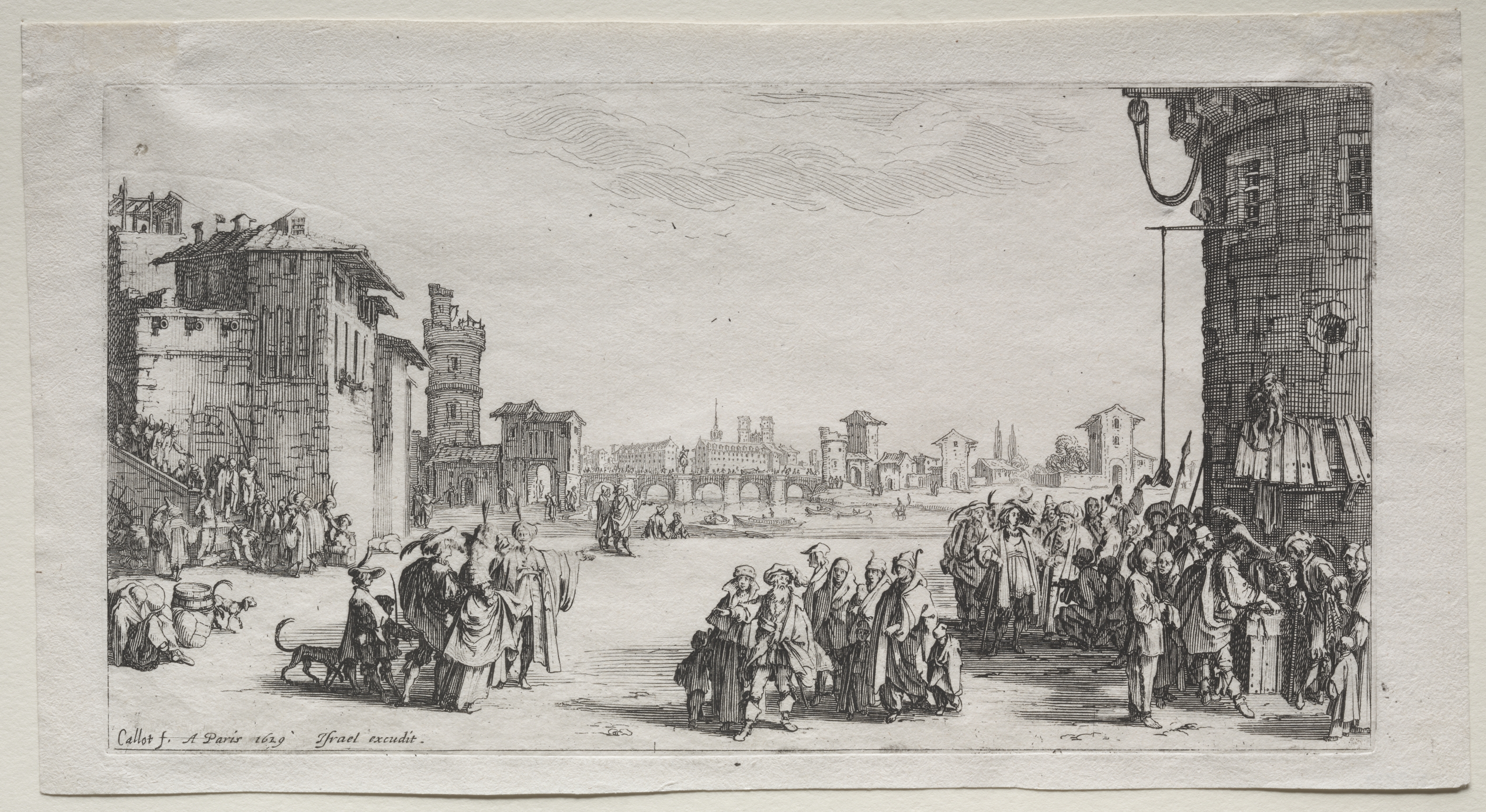 The image depicts a black-and-white etching titled "The Slave Market" by Jacques Callot. The scene shows a large group of people gathered on a street, with some standing in a crowd on the right side and others on the left. People are dressed in old-fashioned clothing, including hats, cloaks, and robes. On the right side, a crowd surrounds a platform or steps where several people are standing. On the left side, people are near a staircase leading up to a building, and a woman sits on the ground next to a dog and a large object. Buildings line the street, including a large stone structure on the right side with a balcony and awning. In the background, there are more buildings and a bridge spanning a body of water. The sky above is cloudy. The etching is signed "Callot f. A Paris 1629" and "Israel excudit" in the bottom-left corner. The image is set against a beige background.