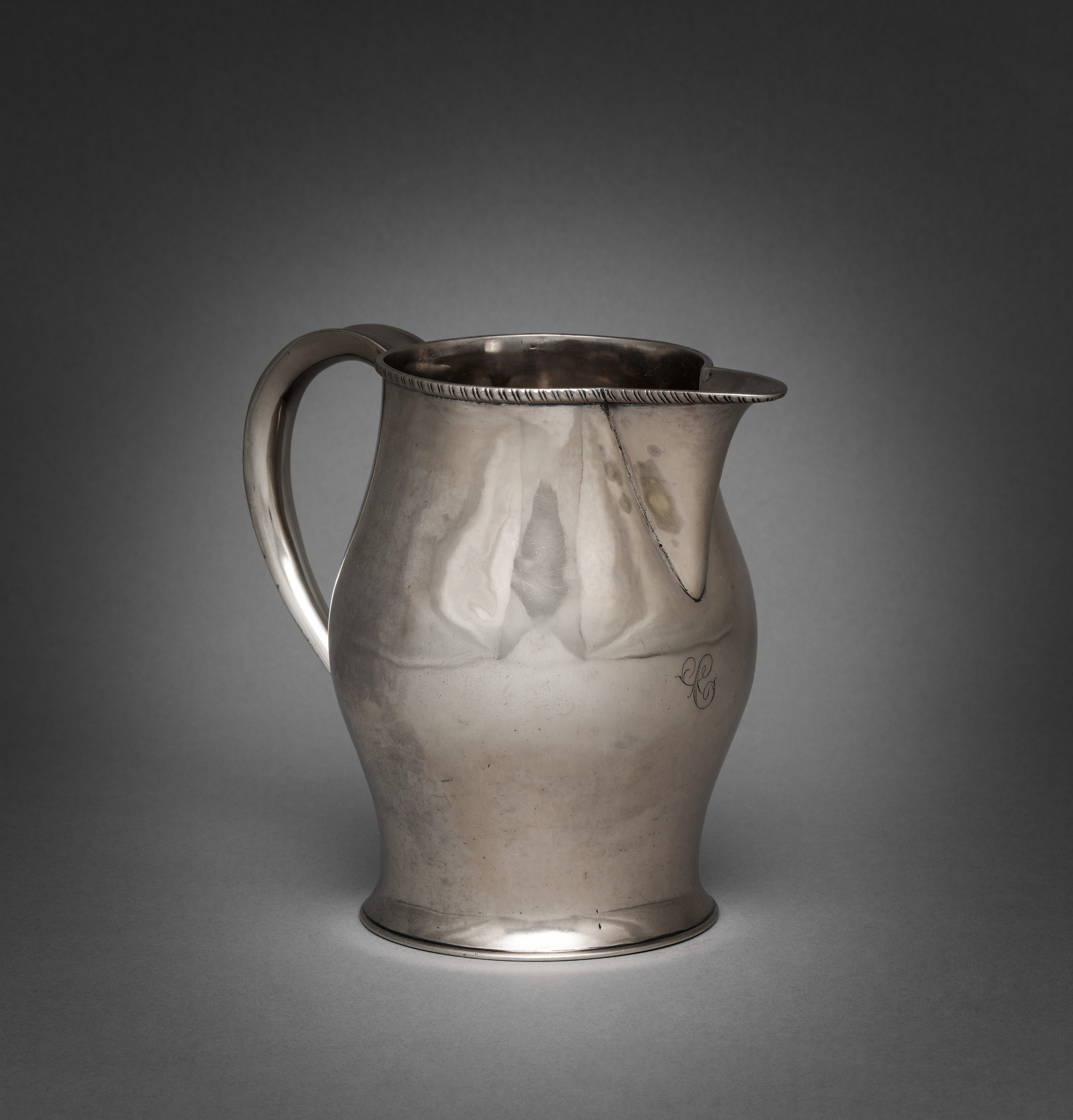 Silver pitcher with a handle on the left side, spout on the right, and a decorative rim. The body is shaped with a narrow base that widens towards the middle and tapers towards the top. There are some dark spots and marks on the surface, and a small signature or monogram on the lower right side. The background is dark gray, with a lighter gray gradient around the pitcher. The artist of this pitcher is Charles Greene.