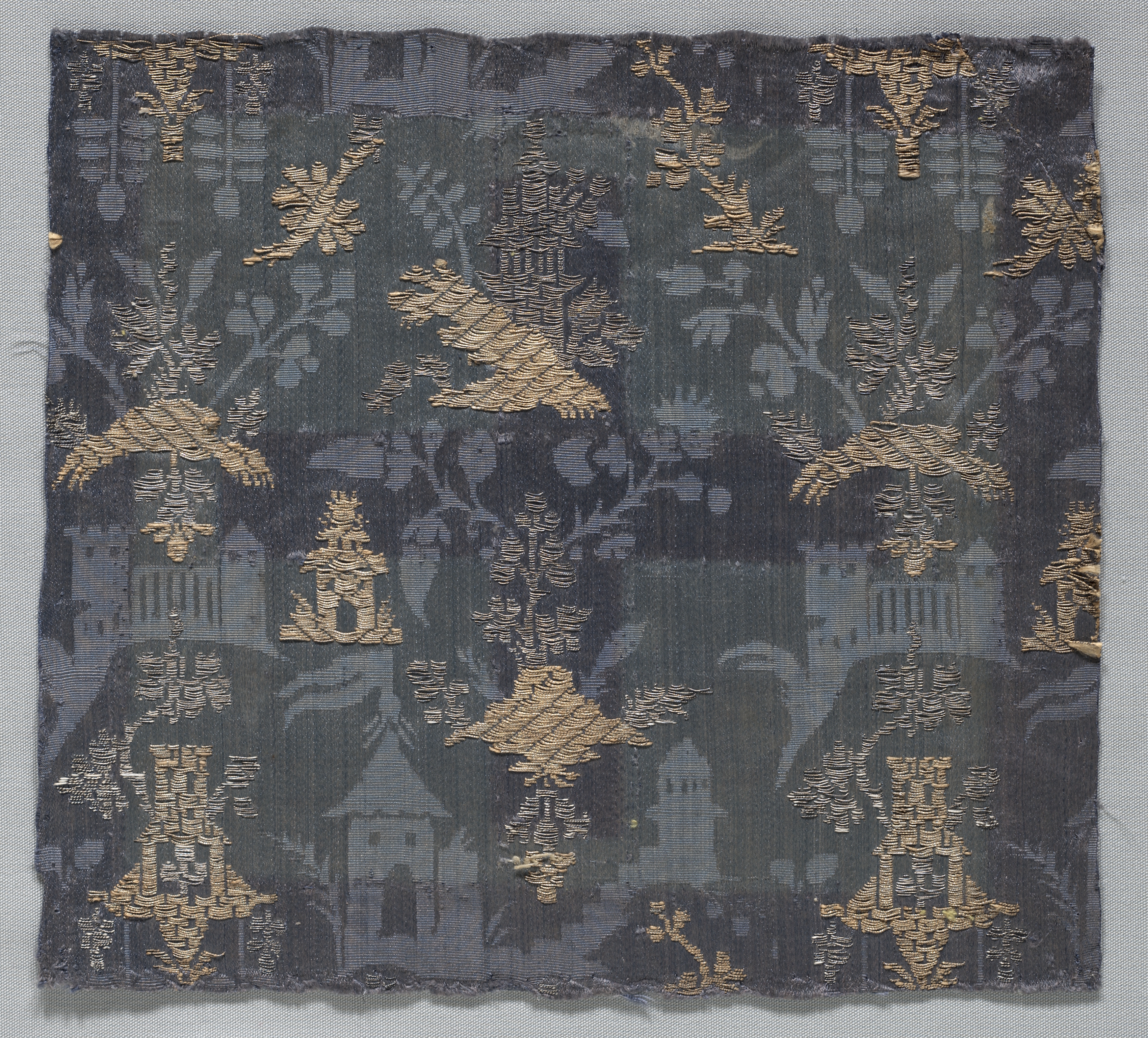 Dark gray fabric with gold and light gray pattern. The fabric is square with a frayed edge. The pattern features a repeating design of trees, buildings, and other foliage in gold and light gray on a dark gray background. The gold elements are shiny and reflective. The fabric appears to be a type of brocaded damask, a woven fabric known for its rich, luxurious appearance.