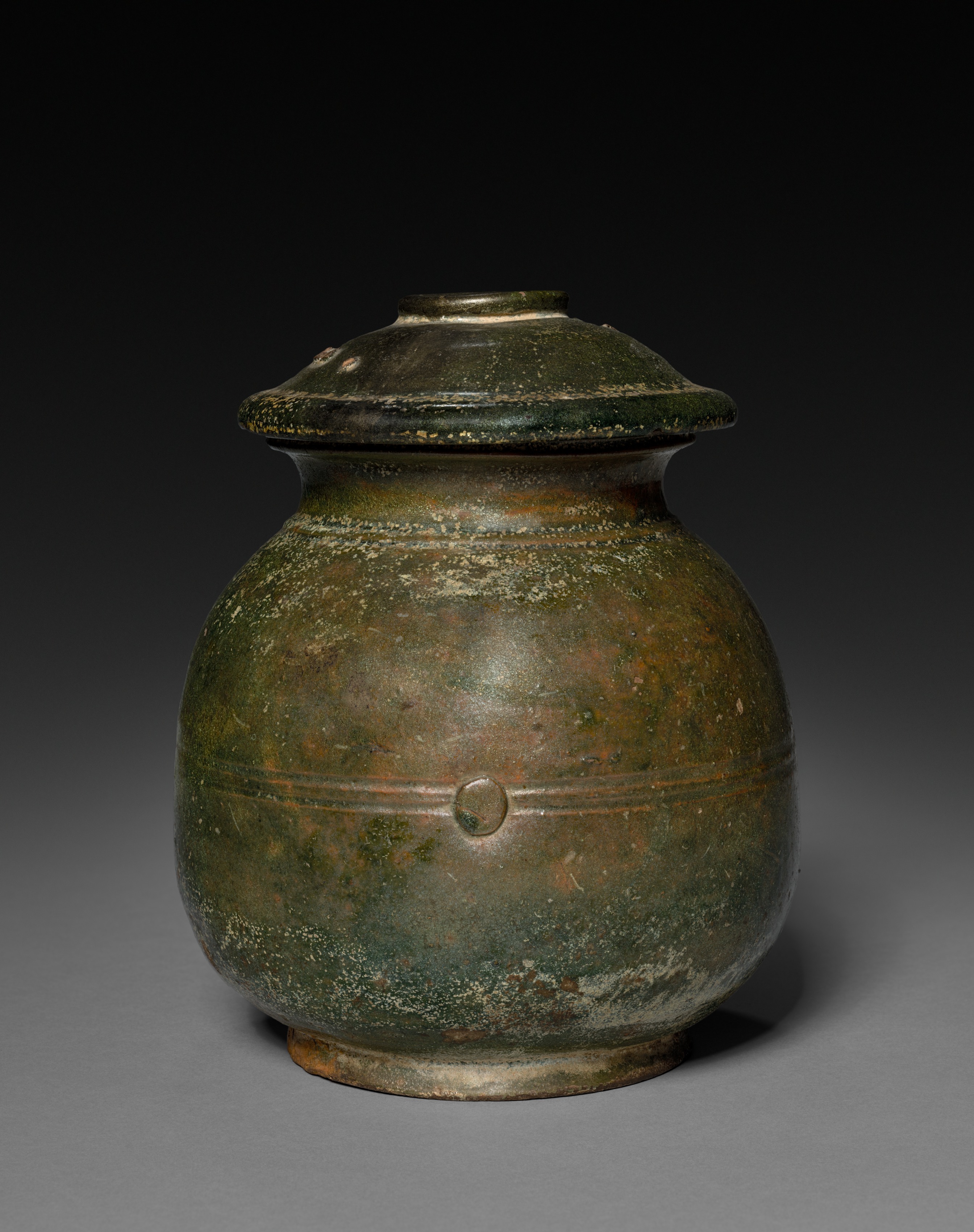 The Jar with Cover by artist unknown, is a rounded vessel made from bronze or brass. The jar has a wide rounded body with a short neck and a small circular knob on the front. Two parallel horizontal lines encircle the body. The lid is domed with a small knob on top. The surface is green and brown with a mottled patina. The base is flat. The background is dark gray to black.
