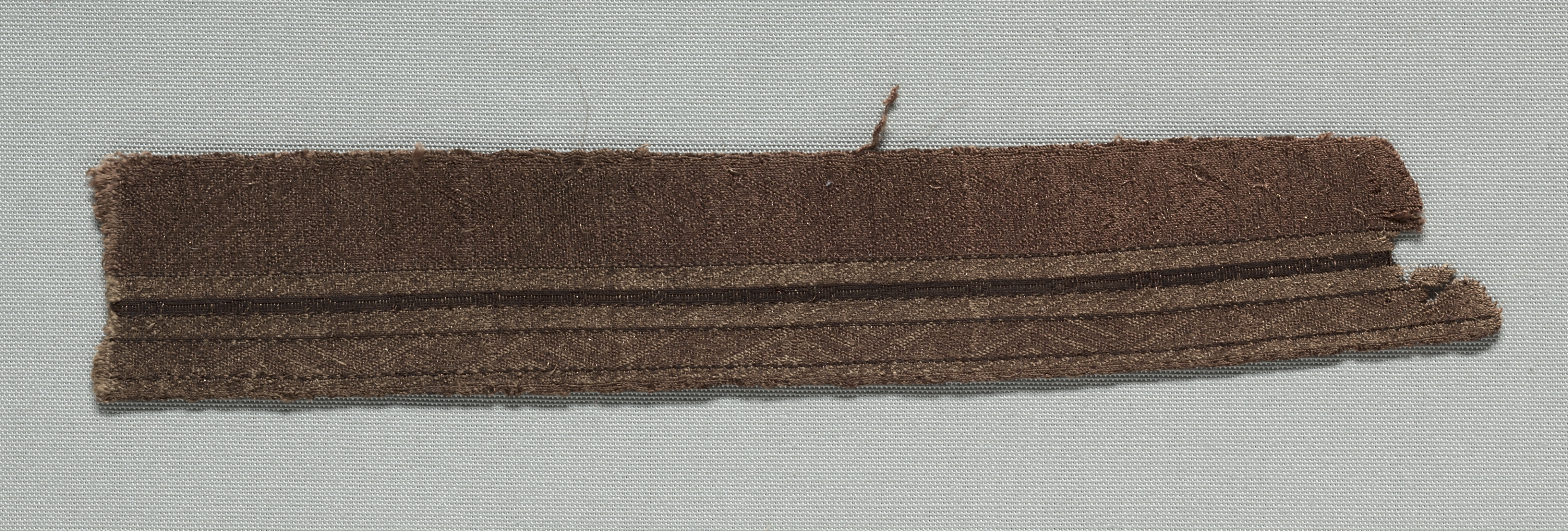 Brown fabric piece, rectangular with rough edges, three horizontal stitched lines across, top line thinnest and darkest, middle and bottom lines thicker and lighter, fabric appears frayed and worn, on light grey background. Fragment of a Band (2 of 2) by Anni Albers.