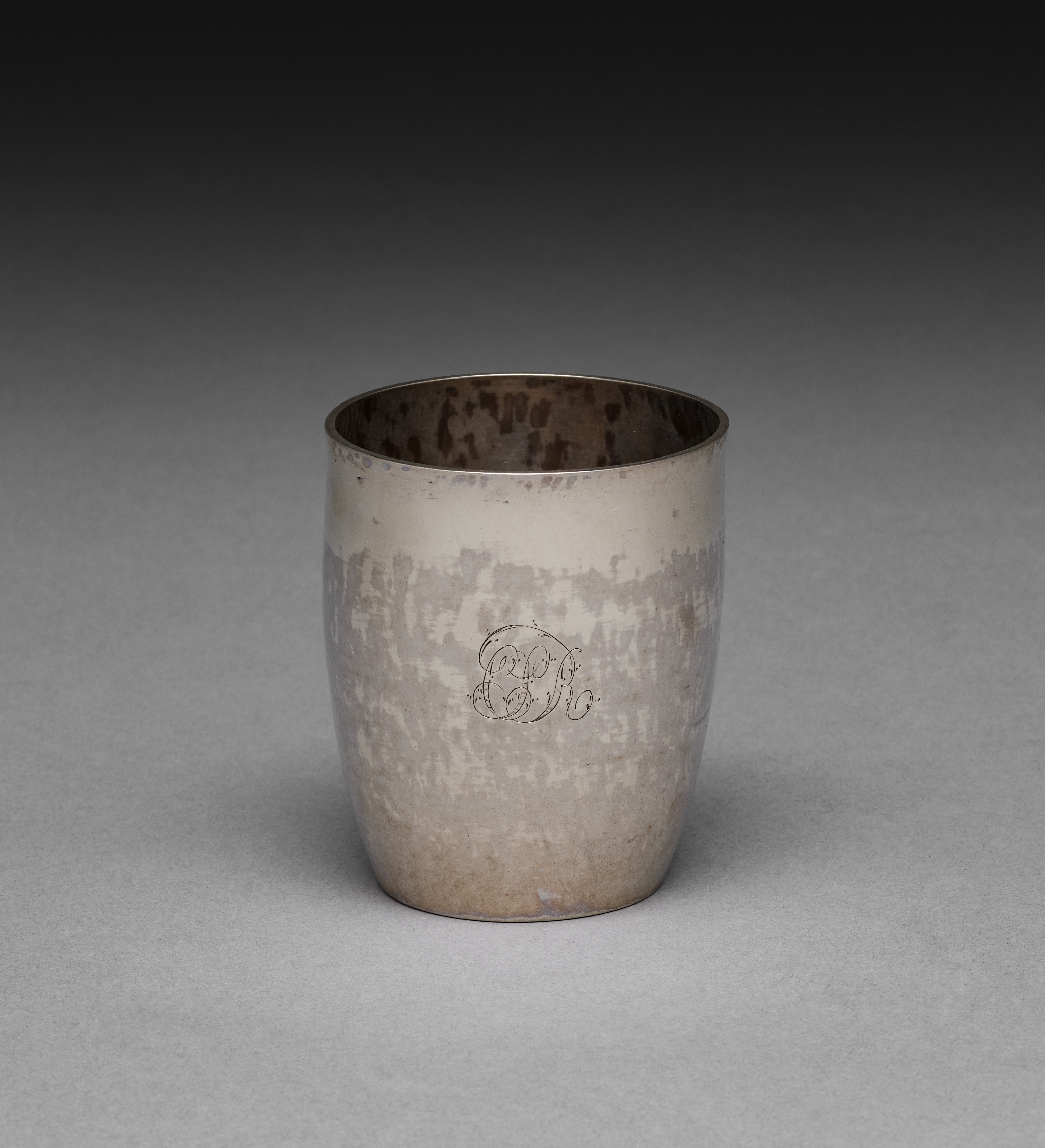 Thomas Knox Emery's Beaker: A silver beaker with a cylindrical body, slightly wider at the top than the bottom. The beaker has a worn, tarnished appearance with patches of darker discoloration. The exterior surface features an etched monogram. The background is a grey gradient that darkens towards the top.