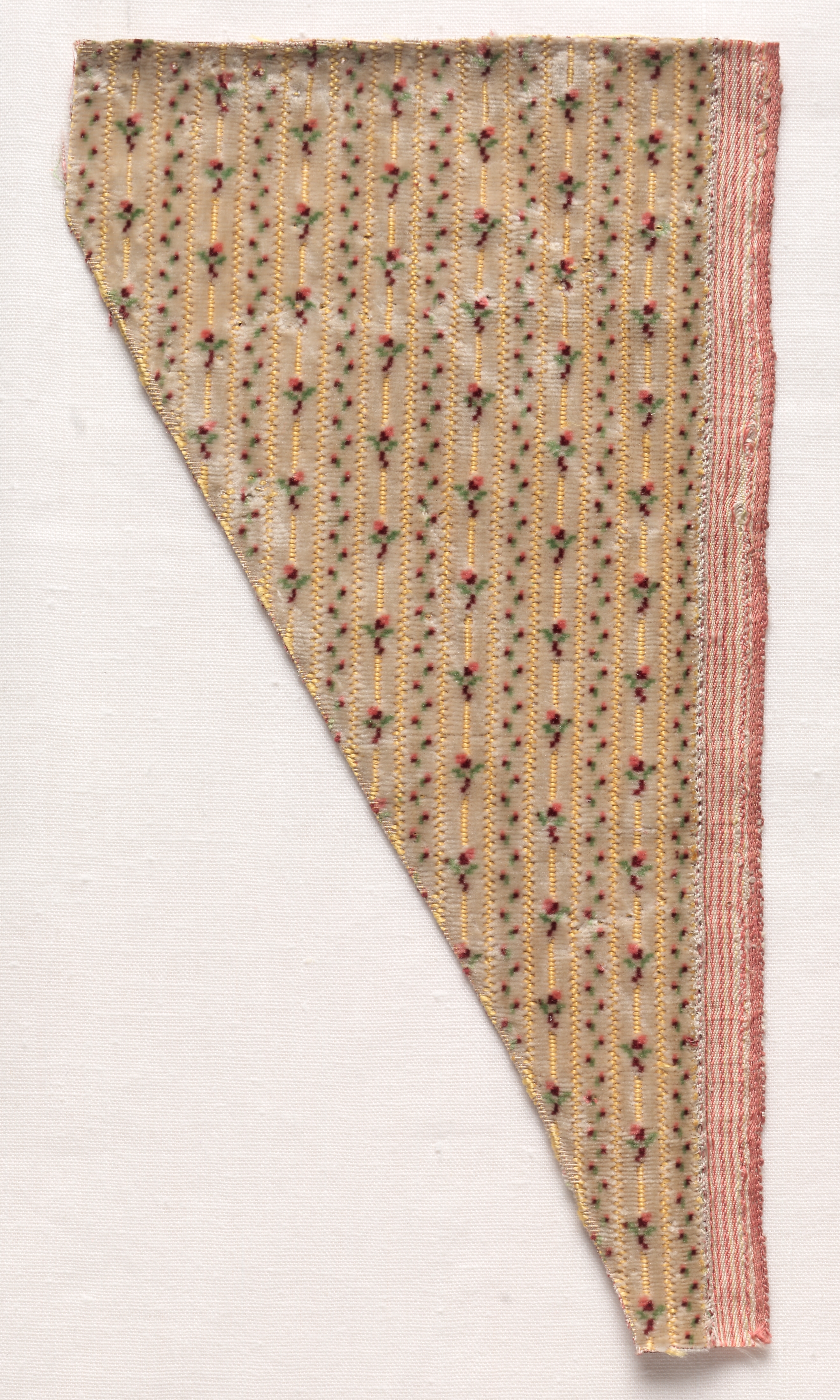 Tan fabric with vertical yellow lines and small red and green dots. Red and white striped edge on right side. Triangular shape. Fabric appears frayed at edges. Background is white. Title: Textile Fragment. Artist not specified.